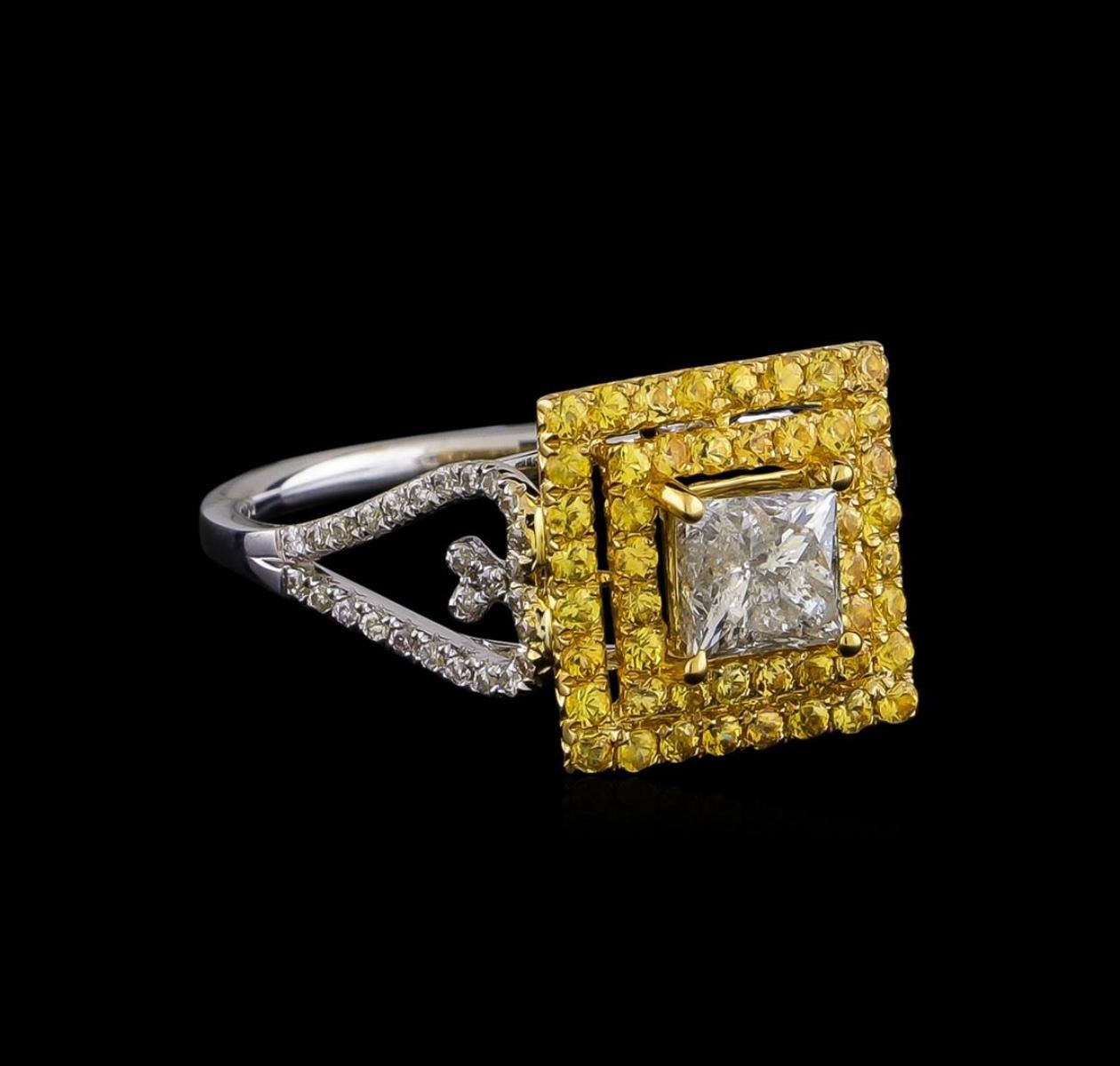 One electronically tested 14KT yellow gold ladies cast diamond and yellow sapphire ring. The featured diamond is set within a tiered yellow sapphire bezel supported by diamond set heart shoulders, completed by a one millimeter wide band. Bright polish finish with rhodium accents. Identified with markings of "14K". Condition is new, good workmanship. Containing: One prong set princess cut diamond, measuring 4.80 x 4.60 x 3.45mm (depth est.) approximate weight of 0.66ct. Graded in the setting. Clarity: I-2. Color: GDepth 75.0%. Table 76.1%. Fifty-Four prong set round brilliant cut diamonds, measuring 1.00 - 0.90 x 0.57mm (depth est.) approximate total weight of 54 Stones = 0.19ct. Color & clarity grade are an average for the group. Graded in the setting. Clarity: SI-2 to I-1. Color: G - I Forty-eight prong set round mixed cut natural yellow sapphires, measuring 1.30 - 1.30 x 0.85 mm, approximate total weight of 0.55ct., clarity is eye clean, type II, medium, moderately strong, orangy yellow color, (GIA oY 5/4), cut is good. Transmitting light with no distortion, transparent. Measurements & the color grade are an average for the group. Graded in the setting.Total Weight of Colored Stones 0.55ct. Total Weight of Diamonds 0.85ct. Total Weight of Ring 3.11gm. AIG Appraised.