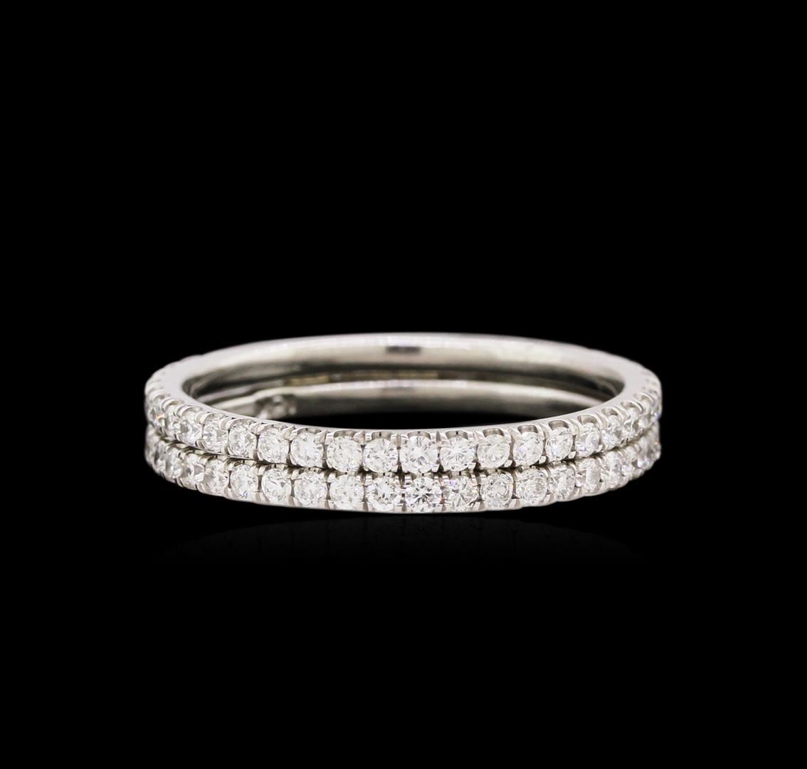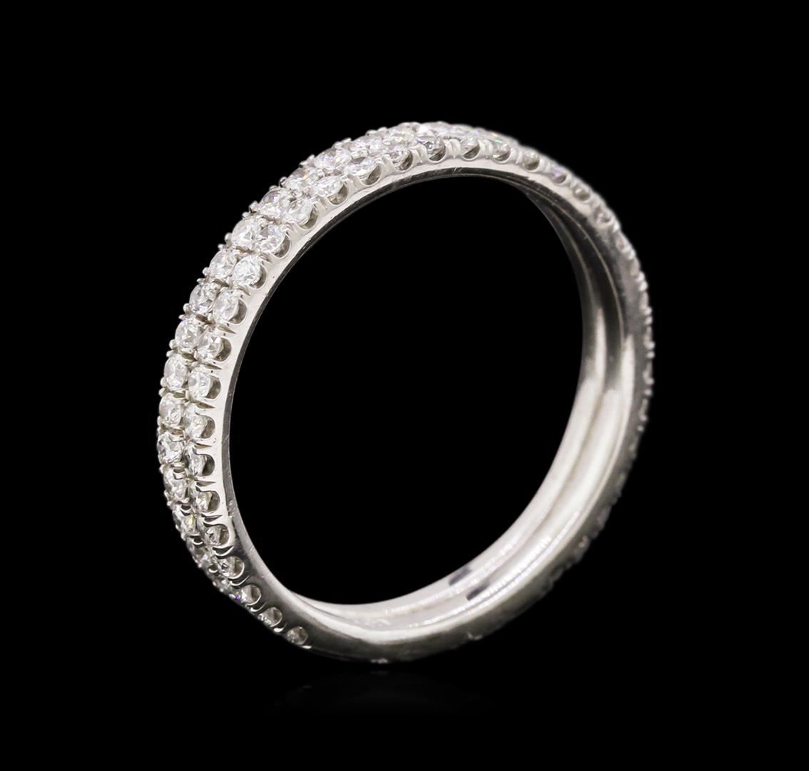 One electronically tested 18KT white gold lady's combination cast & assembled wedding band with a bright polish finish. The featured lady's ring has a double shank measuring 3.50 millimeters wide. Identified with markings of "18K". Condition is new, good workmanship. Containing: Seventy split prong set round brilliant cut diamonds, measuring 1.50 - 1.40 x 0.94mm (depth est.) approximate total weight of 70 Stones = 0.85ct. Graded in the setting. Clarity: SI-1 to SI-2. Color: G - Good. Total Weight of Diamonds 0.85ct. Total Weight of Band 2.60gm. GAS Appraised at $3,135.00.