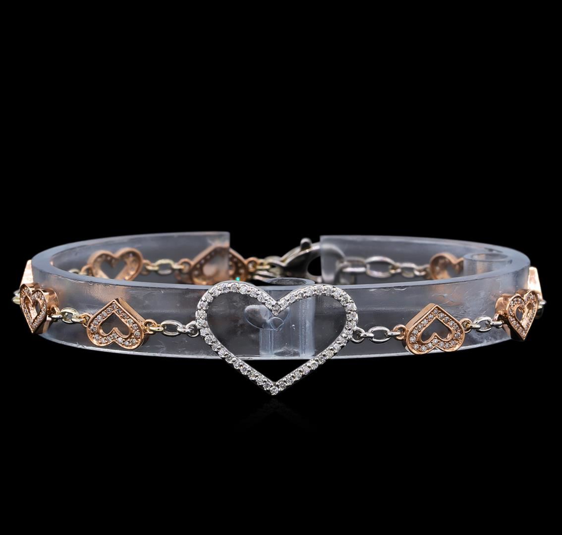 One electronically tested 14KT rose and white gold lady's combination cast & assembled fashion bracelet with a lobster claw clasp with a bright polish finish. The featured lady's bracelet has interlocking heart motif links and can be worn between 7.5 and 8.5 inches in length. Identified with markings of "14K". Condition is new, good workmanship. Containing: One Hundred Sixty-Two prong set round brilliant cut diamonds, measuring 1.00 - 0.95 x 0.62mm (depth est.) approximate total weight of 162 Stones = 0.58ct. Graded in the setting. Clarity: VS-2 to SI-1. Color: H - I. Cut Very Good Forty-Four prong set round brilliant cut diamonds, measuring 1.25 - 1.15 x 0.73mm (depth est.) approximate total weight of 44 Stones = 0.28ct. Graded in the setting. Clarity: VS-2 to SI-1. Color: G - I. Cut Very Good. Total Weight of Diamonds 0.86ct. Total Weight of Bracelet 8.50gm. GAS Appraised at $6,260.00.