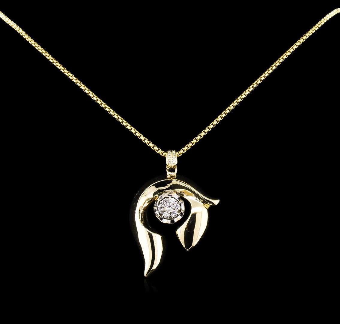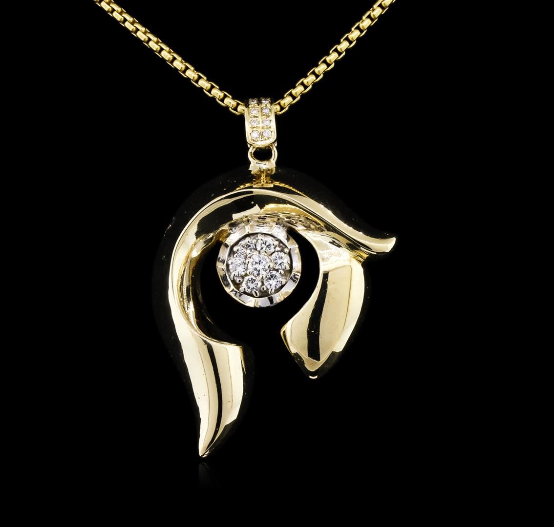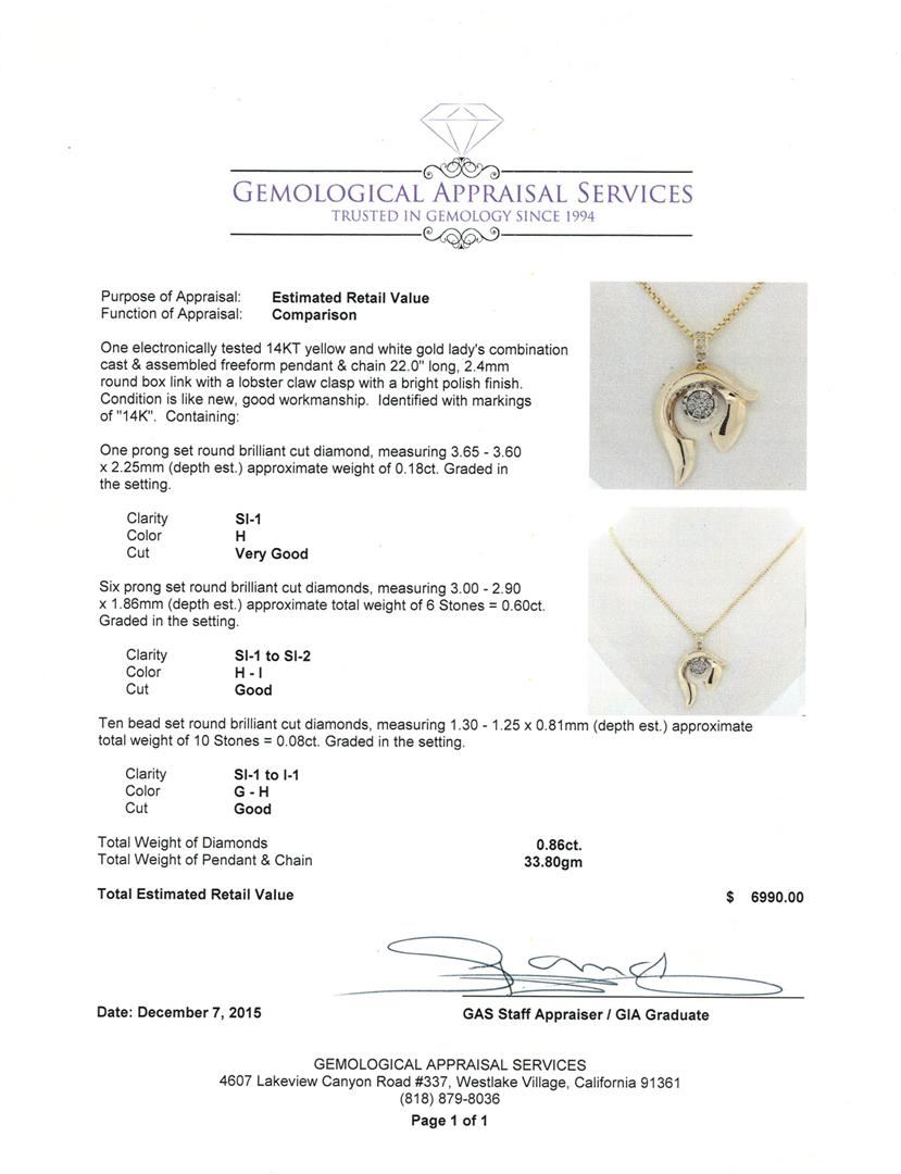 One electronically tested 14KT yellow and white gold lady's combination cast & assembled freeform pendant & chain 22.0" long, 2.4mm round box link with a lobster claw clasp with a bright polish finish. Identified with markings of "14K". Condition is like new, good workmanship. Containing: One prong set round brilliant cut diamond, measuring 3.65 - 3.60 x 2.25mm (depth est.) approximate weight of 0.18ct. Graded in the setting. Clarity: SI-1. Color: Very Good Six prong set round brilliant cut diamonds, measuring 3.00 - 2.90 x 1.86mm (depth est.) approximate total weight of 6 Stones = 0.60ct. Graded in the setting. Clarity: SI-1 to SI-2. Color: H - I. Cut Good Ten bead set round brilliant cut diamonds, measuring 1.30 - 1.25 x 0.81mm (depth est.) approximate total weight of 10 Stones = 0.08ct. Graded in the setting. Clarity: SI-1 to I-1. Color: G - Good. Total Weight of Diamonds 0.86ct. Total Weight of Pendant & Chain 33.80gm. GAS Appraised at $6,990.00.