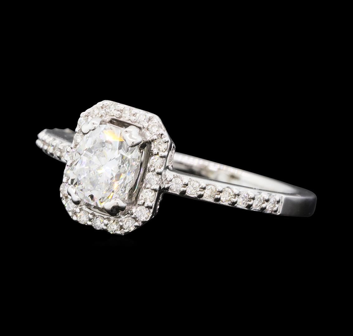One electronically tested 14KT white gold lady's cast wedding ring with a cathedral shank with a basket halo with a bright polish finish. The featured lady's ring has a shank measuring 1.52 millimeters wide. Identified with markings of '14K'. Condition is new, good workmanship. Containing: One prong set cushion cut diamond, measuring 5.70 x 4.80 x 3.40mm (depth est.) approximate weight of 0.72ct. Graded in the setting. Color H Clarity SI-1 Cut Good Thirty-Four prong set round brilliant cut diamonds, measuring 1.10 - 1.00 x 0.63mm (depth est.) approximate total weight of 34 Stones = 0.14ct. Graded in the setting. Color H - I Clarity SI-1 to I-1 Cut Good. Total Weight of Diamonds 0.86ct.. Total Weight of Ring 2.70gm GAS Appraised at $6,380.00.