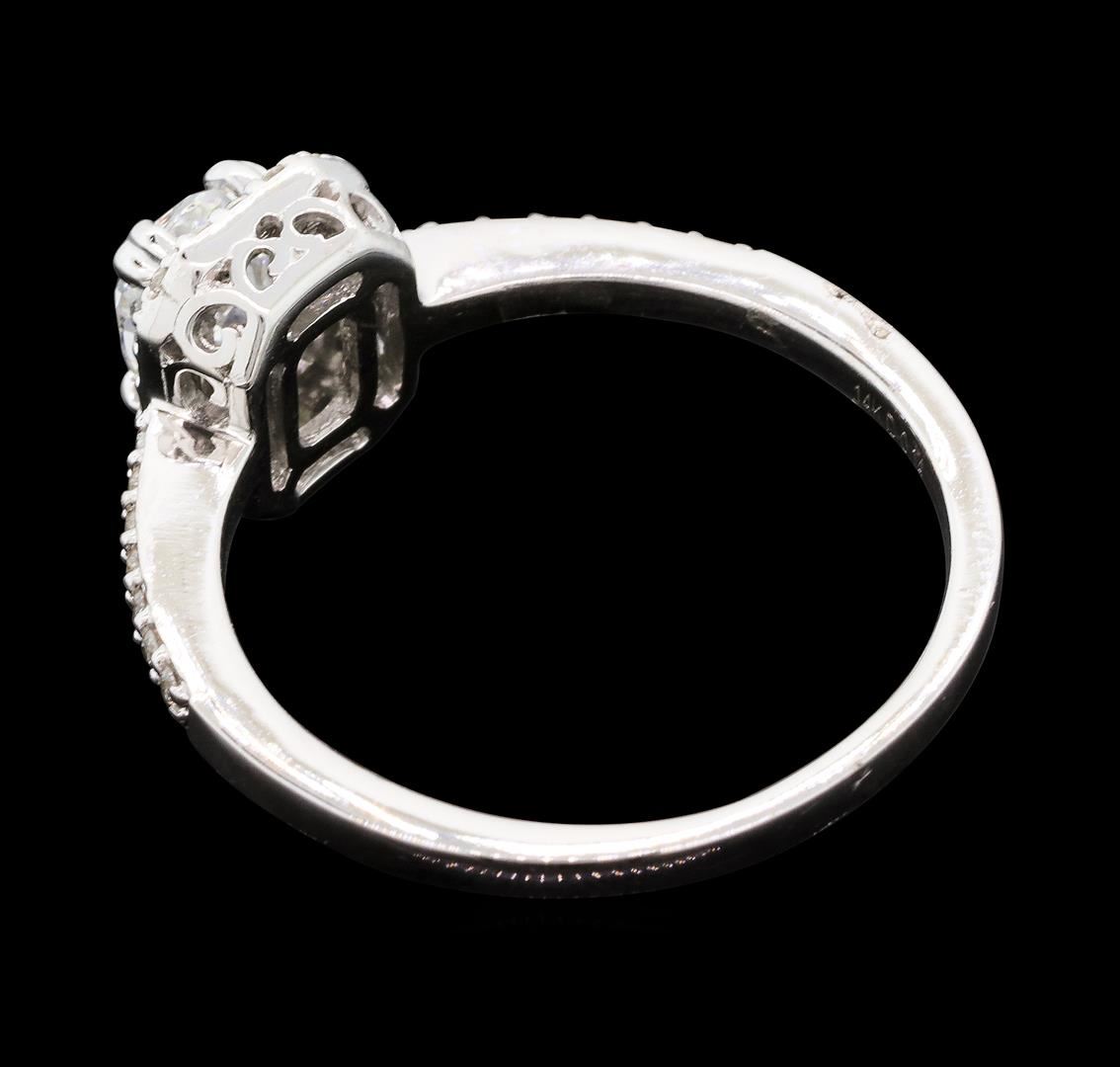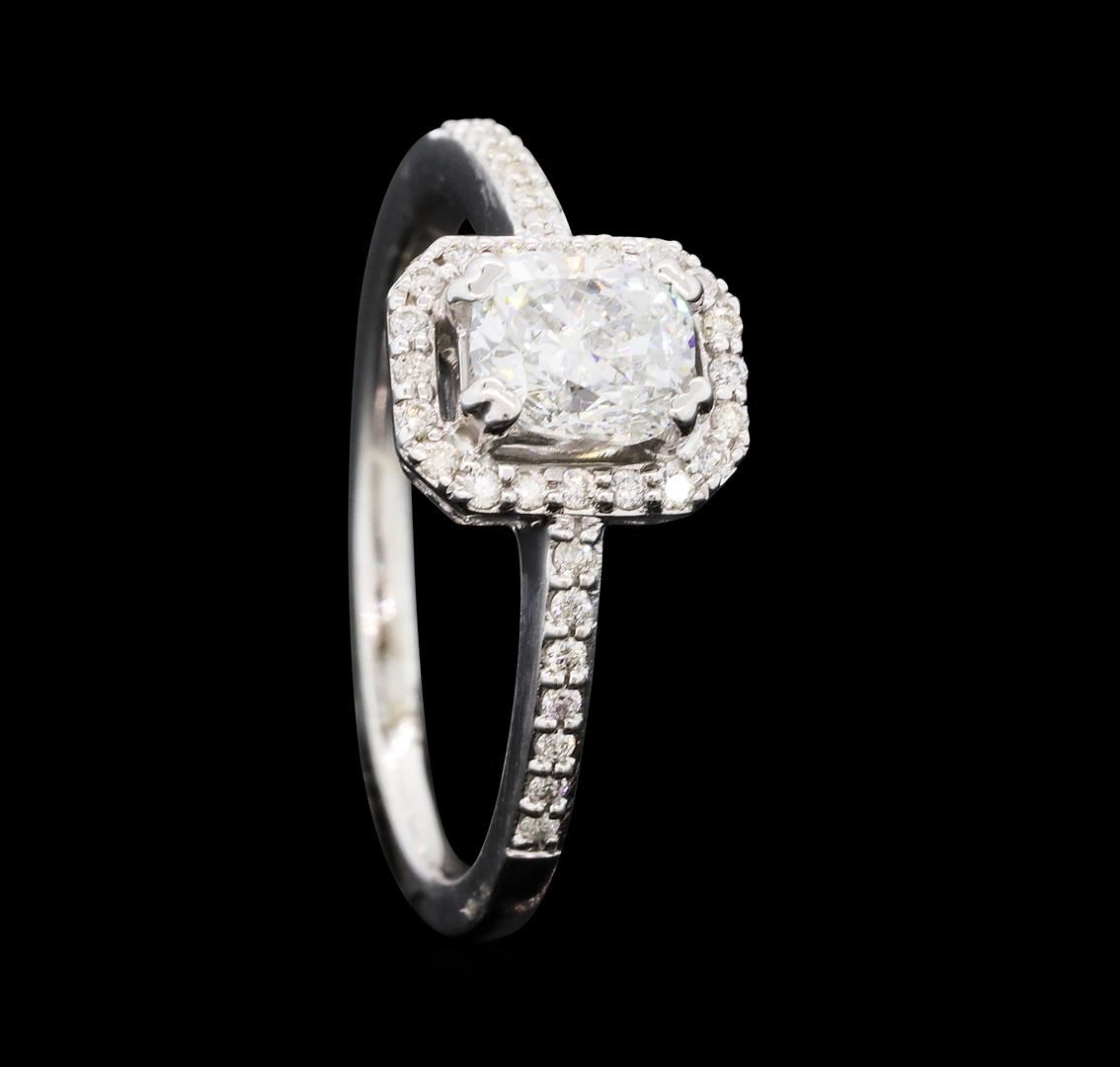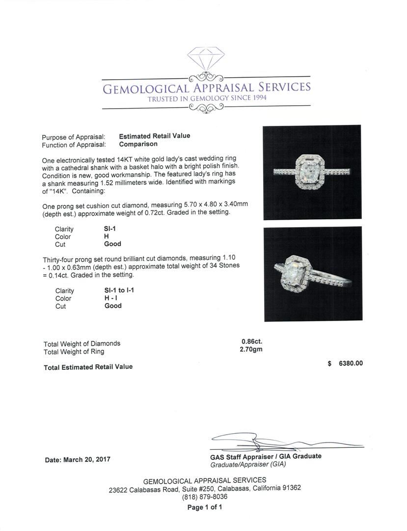 One electronically tested 14KT white gold lady's cast wedding ring with a cathedral shank with a basket halo with a bright polish finish. The featured lady's ring has a shank measuring 1.52 millimeters wide. Identified with markings of '14K'. Condition is new, good workmanship. Containing: One prong set cushion cut diamond, measuring 5.70 x 4.80 x 3.40mm (depth est.) approximate weight of 0.72ct. Graded in the setting. Color H Clarity SI-1 Cut Good Thirty-Four prong set round brilliant cut diamonds, measuring 1.10 - 1.00 x 0.63mm (depth est.) approximate total weight of 34 Stones = 0.14ct. Graded in the setting. Color H - I Clarity SI-1 to I-1 Cut Good. Total Weight of Diamonds 0.86ct.. Total Weight of Ring 2.70gm GAS Appraised at $6,380.00.
