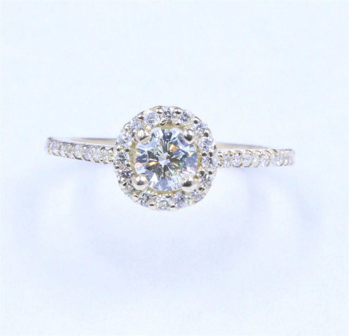 One lady's ring featuring: 14KT yellow gold weighing 1.83 grams containing one center diamond weighing 0.63ct and side diamonds weighing 0.23ctw. The center diamond is round brilliant cut with SI1 clarity, H color and very good cut. The side diamonds are