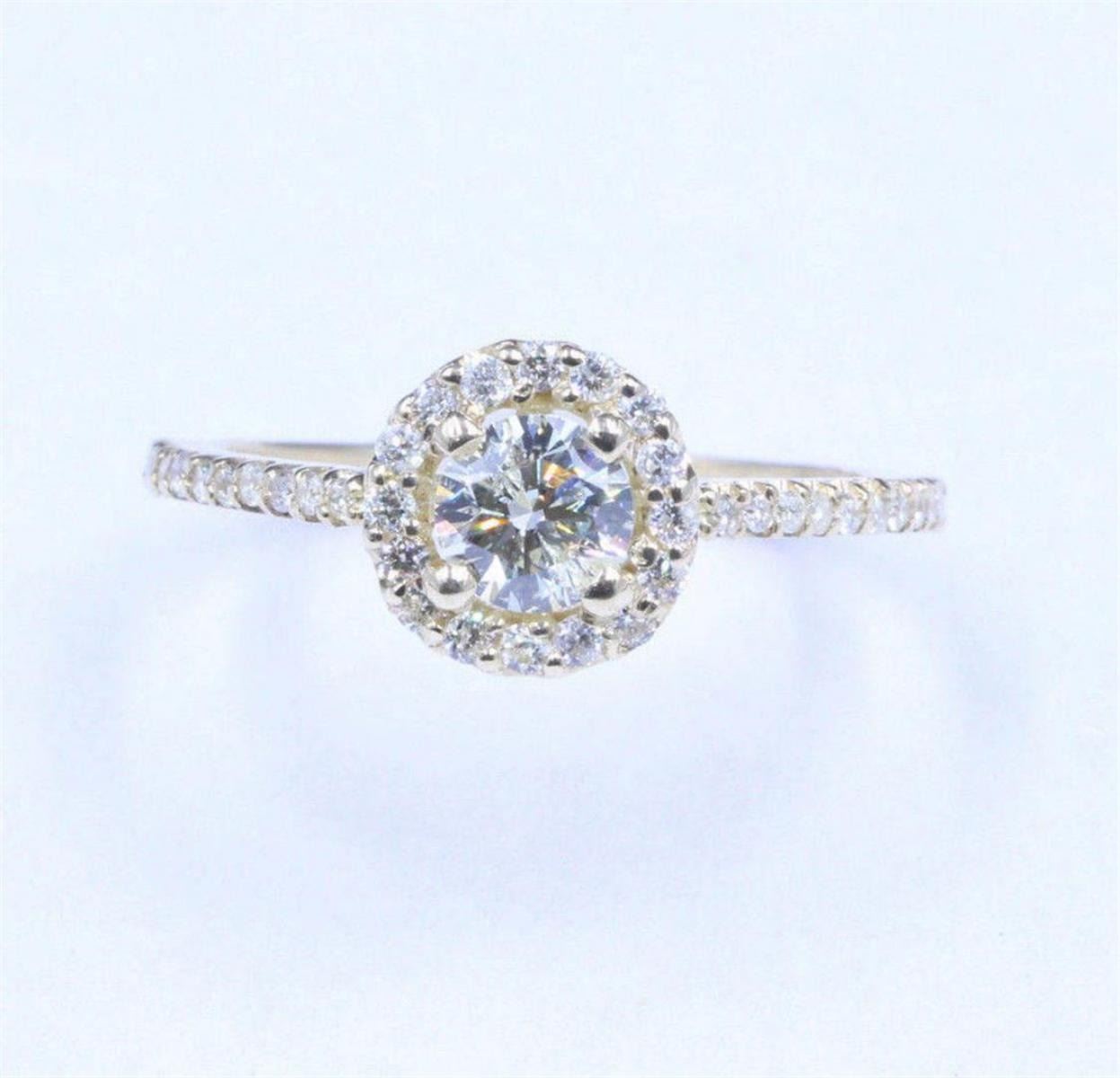 One lady's ring featuring: 14KT yellow gold weighing 1.83 grams containing one center diamond weighing 0.63ct and side diamonds weighing 0.23ctw. The center diamond is round brilliant cut with SI1 clarity, H color and very good cut. The side diamonds are round brilliant cut with SI1 clarity, G color and very good cut. The ring is a size 6.25 but can be resized.