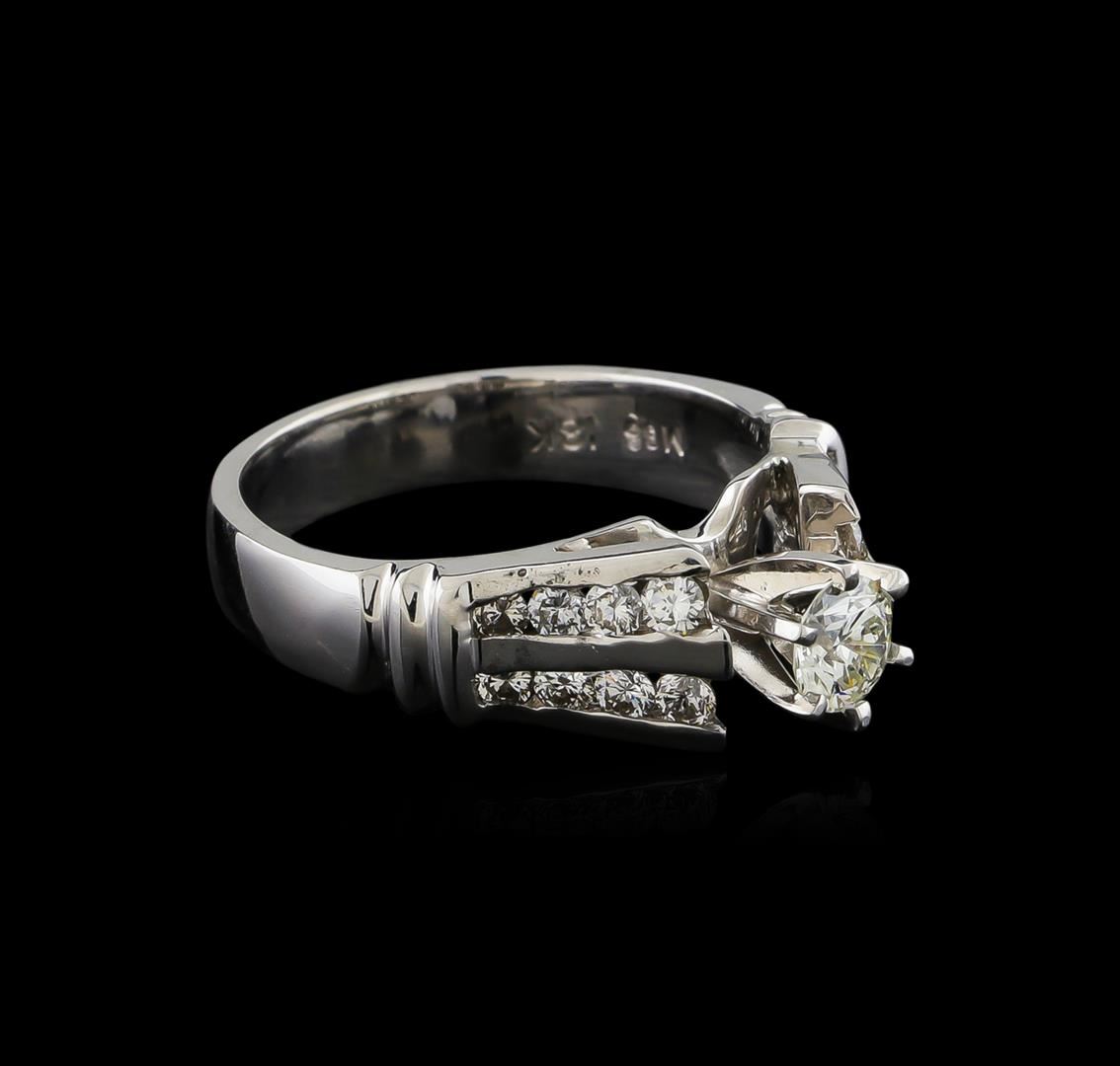 One electronically tested 18KT white gold lady's cast wedding ring with a cathedral shank with a bright polish finish. The featured lady's ring has a shank measuring 3.68 millimeters wide. Identified with markings of "18K". Condition is new, good workmanship. Containing: One prong set round brilliant cut diamond, measuring 4.46 - 4.42 x 2.80mm (depth est.) approximate weight of 0.34ct. Graded in the setting. Clarity: SI-2. Color: I. Cut Very Good Sixteen channel set round brilliant cut diamonds, measuring 2.10 - 2.00 x 1.27mm (depth est.) approximate total weight of 16 Stones = 0.52ct. Graded in the setting. Clarity: VS-2 to SI-2. Color: I - J. Cut Good. Total Weight of Diamonds 0.86ct. Total Weight of Ring 5.80gm. GAS Appraised at $4,115.00.