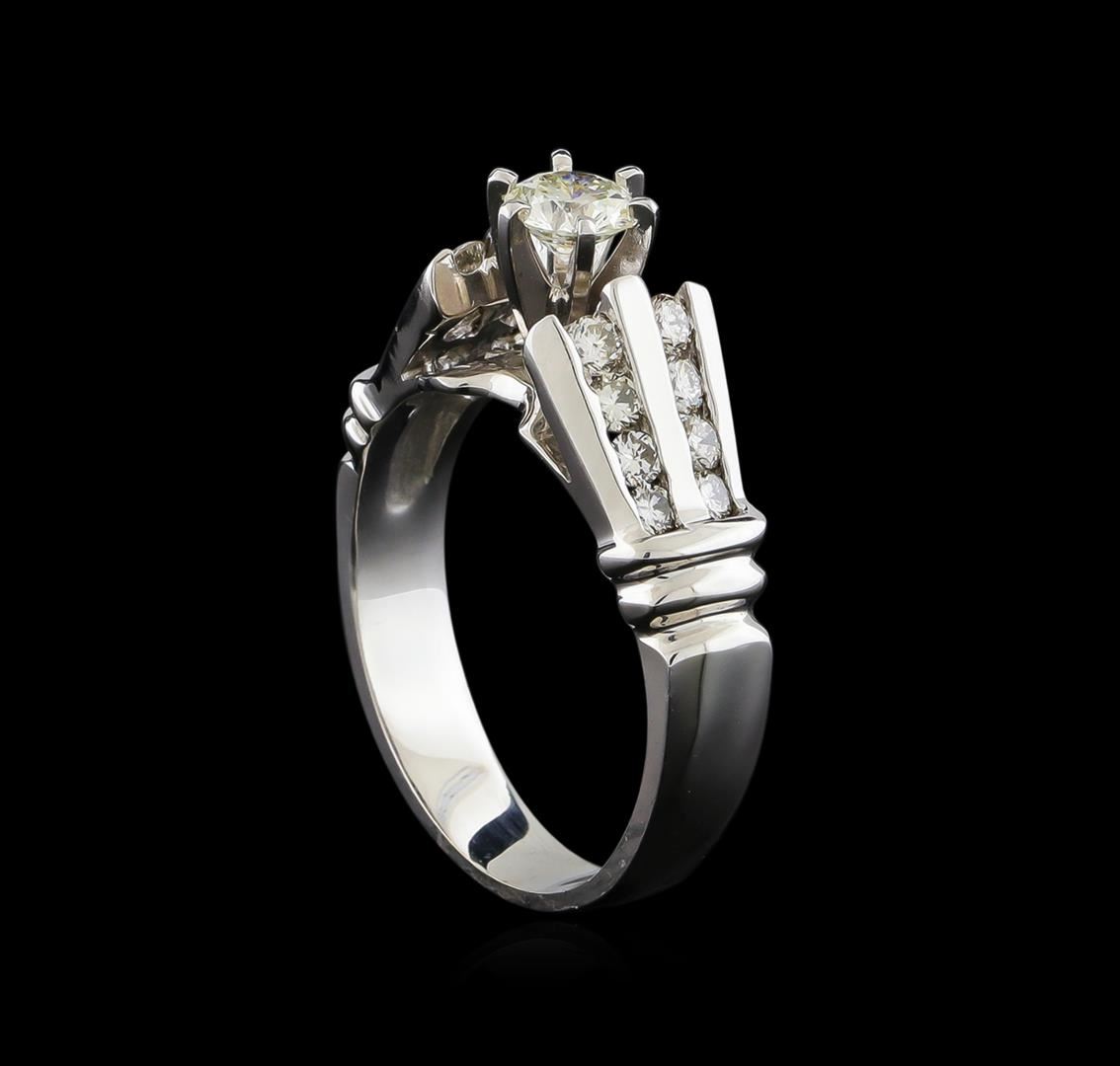 One electronically tested 18KT white gold lady's cast wedding ring with a cathedral shank with a bright polish finish. The featured lady's ring has a shank measuring 3.68 millimeters wide. Identified with markings of "18K". Condition is new, good workmanship. Containing: One prong set round brilliant cut diamond, measuring 4.46 - 4.42 x 2.80mm (depth est.) approximate weight of 0.34ct. Graded in the setting. Clarity: SI-2. Color: I. Cut Very Good Sixteen channel set round brilliant cut diamonds, measuring 2.10 - 2.00 x 1.27mm (depth est.) approximate total weight of 16 Stones = 0.52ct. Graded in the setting. Clarity: VS-2 to SI-2. Color: I - J. Cut Good. Total Weight of Diamonds 0.86ct. Total Weight of Ring 5.80gm. GAS Appraised at $4,115.00.