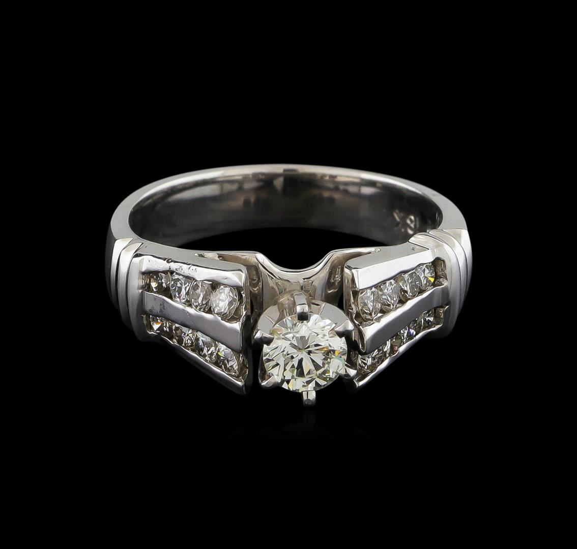 One electronically tested 18KT white gold lady's cast wedding ring with a cathedral shank with a bright polish finish. The featured lady's ring has a shank measuring 3.68 millimeters wide. Identified with markings of "18K". Condition is new, good workmanship. Containing: One prong set round brilliant cut diamond, measuring 4.46 - 4.42 x 2.80mm (depth est.) approximate weight of 0.34ct. Graded in the setting. Clarity: SI-2. Color: I. Cut Very Good Sixteen channel set round brilliant cut diamonds, measuring 2.10 - 2.00 x 1.27mm (depth est.) approximate total weight of 16 Stones = 0.52ct. Graded in the setting. Clarity: VS-2 to SI-2. Color: I - J. Cut Good. Total Weight of Diamonds 0.86ct. Total Weight of Ring 5.80gm. GAS Appraised at $4,115.00.