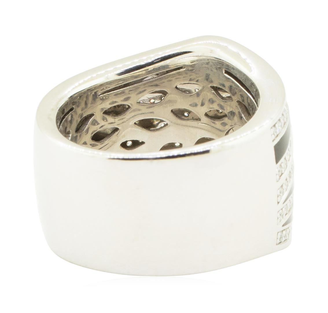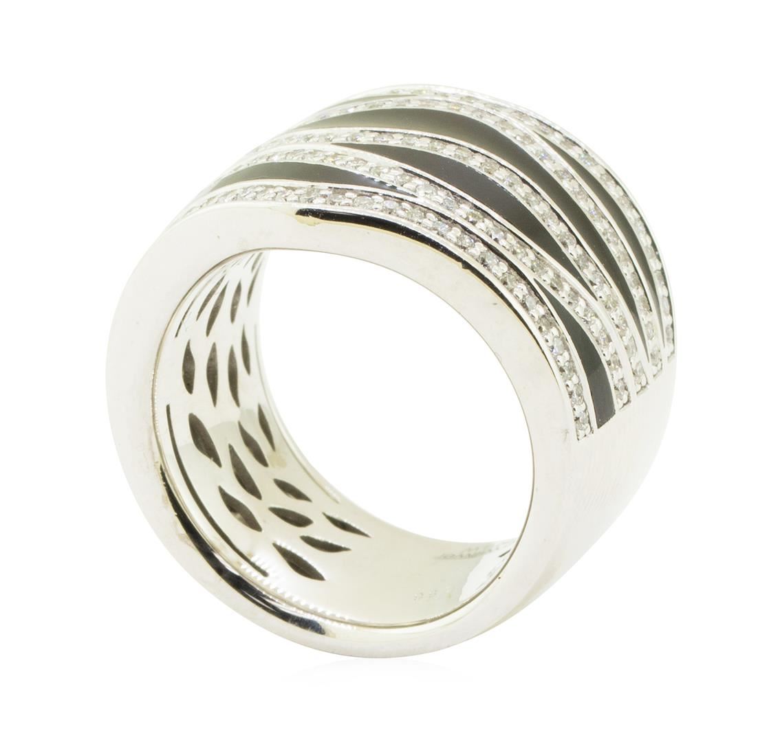 One electronically tested 18KT white gold lady's cast fashion designer ring with a wide band wave motif with a bright polish finish. The featured lady's ring has seven unique sections of shiny black enamel and a shank measuring 12.20 millimeters in width. Trademark is Leo Wittwer. Identified with markings of '750'. Condition is like new, good workmanship. Containing: One Hundred Forty-One prong set round brilliant cut diamonds, measuring 1.20 - 1.15 x 0.73mm (depth est.) approximate total weight of 141 Stones = 0.86ct. Graded in the setting. Color F - G Clarity VVS-2 to VS-1 Cut Excellent. Total Weight of Diamonds 0.86ct.. Total Weight of Ring 23.20gm GAS Appraised at $9800.00. GAS Appraised.