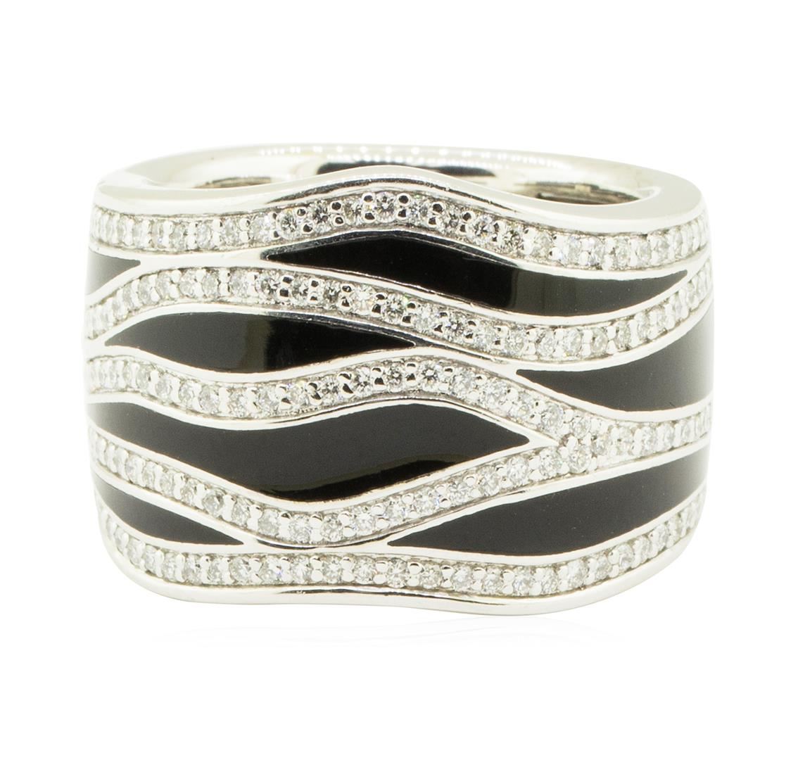 One electronically tested 18KT white gold lady's cast fashion designer ring with a wide band wave motif with a bright polish finish. The featured lady's ring has seven unique sections of shiny black enamel and a shank measuring 12.20 millimeters in width. Trademark is Leo Wittwer. Identified with markings of '750'. Condition is like new, good workmanship. Containing: One Hundred Forty-One prong set round brilliant cut diamonds, measuring 1.20 - 1.15 x 0.73mm (depth est.) approximate total weight of 141 Stones = 0.86ct. Graded in the setting. Color F - G Clarity VVS-2 to VS-1 Cut Excellent. Total Weight of Diamonds 0.86ct.. Total Weight of Ring 23.20gm GAS Appraised at $9800.00. GAS Appraised.