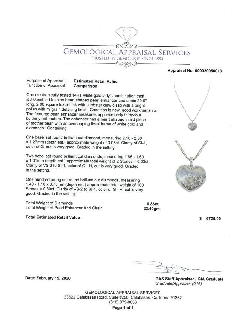 One electronically tested 14KT white gold lady's combination cast & assembled fashion heart shaped pearl enhancer and chain 20.0' long, 2.00 square foxtail link with a lobster claw clasp with a bright polish with milgrain detailing finish. The featured pearl enhancer measures approximately thirty-four by thirty millimeters. The enhancer has a heart shaped inlaid piece of mother pearl with an overlapping floral frame of white gold and diamonds. Condition is new, good workmanship. Containing: One bezel set round brilliant cut diamond, measuring 2.10 - 2.00 x 1.27mm (depth est.) approximate weight of 0.03ct. Graded in the setting. Color G Clarity SI-1 Cut Very Good Two bezel set round brilliant cut diamonds, measuring 1.65 - 1.60 x 1.01mm (depth est.) approximate total weight of 2 Stones = 0.03ct. Graded in the setting. Color G - H Clarity VS-2 to SI-1 Cut Very Good One Hundred prong set round brilliant cut diamonds, measuring 1.40 - 1.10 x 0.78mm (depth est.) approximate total weight of 100 Stones = 0.80ct. Graded in the setting. Color G - H Clarity VS-2 to SI-1 Cut Very Good. Total Weight of Diamonds 0.86ct.. Total Weight of Pearl Enhancer And Chain 23.60gm GAS Appraised at $6725.00. GAS Appraised at $6,725.00.