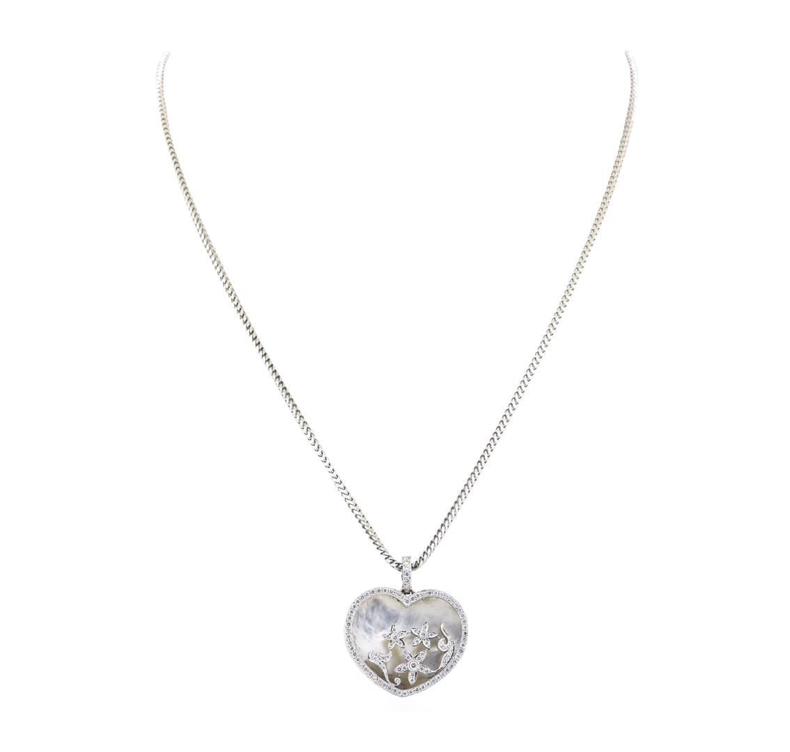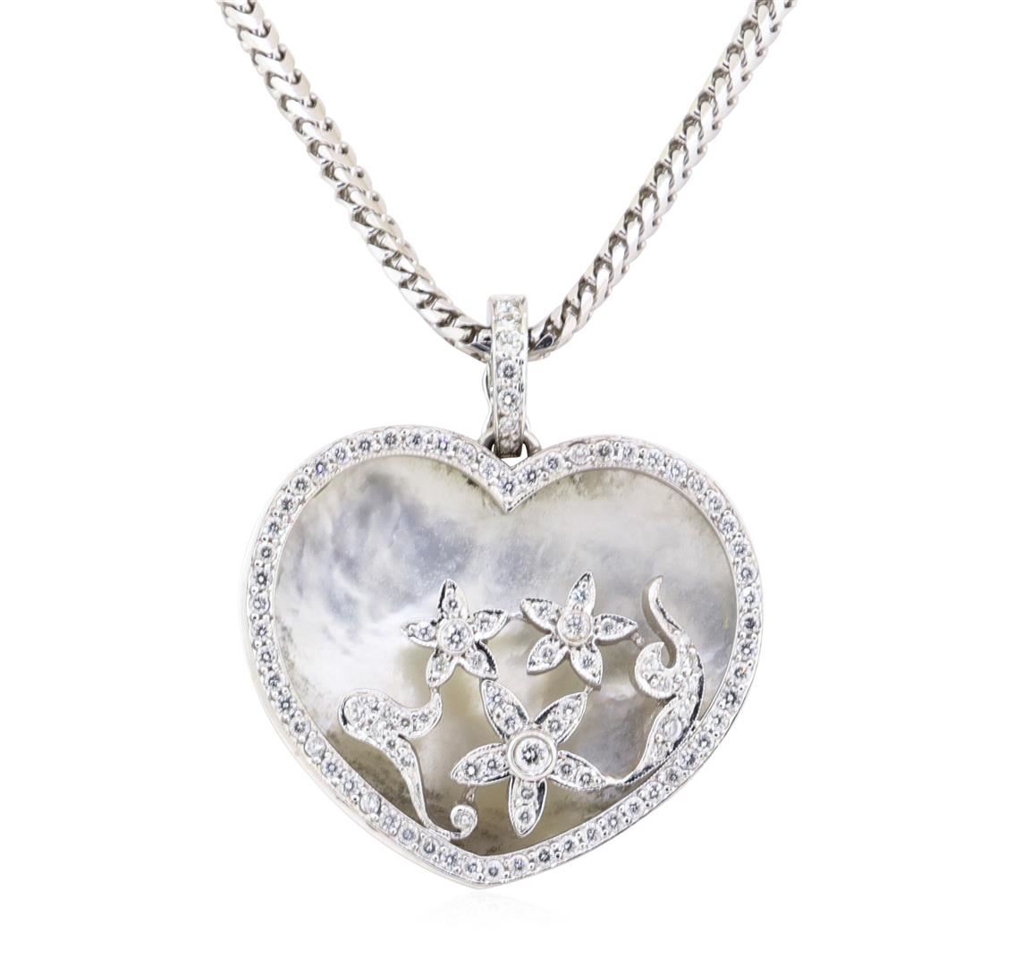 One electronically tested 14KT white gold lady's combination cast & assembled fashion heart shaped pearl enhancer and chain 20.0' long, 2.00 square foxtail link with a lobster claw clasp with a bright polish with milgrain detailing finish. The featured pearl enhancer measures approximately thirty-four by thirty millimeters. The enhancer has a heart shaped inlaid piece of mother pearl with an overlapping floral frame of white gold and diamonds. Condition is new, good workmanship. Containing: One bezel set round brilliant cut diamond, measuring 2.10 - 2.00 x 1.27mm (depth est.) approximate weight of 0.03ct. Graded in the setting. Color G Clarity SI-1 Cut Very Good Two bezel set round brilliant cut diamonds, measuring 1.65 - 1.60 x 1.01mm (depth est.) approximate total weight of 2 Stones = 0.03ct. Graded in the setting. Color G - H Clarity VS-2 to SI-1 Cut Very Good One Hundred prong set round brilliant cut diamonds, measuring 1.40 - 1.10 x 0.78mm (depth est.) approximate total weight of 100 Stones = 0.80ct. Graded in the setting. Color G - H Clarity VS-2 to SI-1 Cut Very Good. Total Weight of Diamonds 0.86ct.. Total Weight of Pearl Enhancer And Chain 23.60gm GAS Appraised at $6725.00. GAS Appraised.