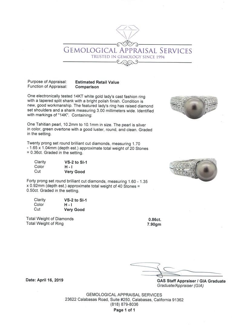 One electronically tested 14KT white gold lady's cast fashion ring with a tapered split shank with a bright polish finish. The featured lady's ring has raised diamond set shoulders and a shank measuring 3.00 millimeters wide. Identified with markings of '14K'. Condition is new, good workmanship. Containing: One Tahitian pearl, 10.2mm to 10.1mm in size. The pearl is silver in color, green overtone with a good luster, round, and clean. Graded in the setting. Twenty prong set round brilliant cut diamonds, measuring 1.70 - 1.65 x 1.04mm (depth est.) approximate total weight of 20 Stones = 0.36ct. Graded in the setting. Color H - I Clarity VS-2 to SI-1 Cut Very Good Forty prong set round brilliant cut diamonds, measuring 1.60 - 1.35 x 0.92mm (depth est.) approximate total weight of 40 Stones = 0.50ct. Graded in the setting. Color H - I Clarity VS-2 to SI-1 Cut Very Good. Total Weight of Diamonds 0.86ct.. Total Weight of Ring 7.90gm GAS Appraised at $3885.00. GAS Appraised at $3,885.00.