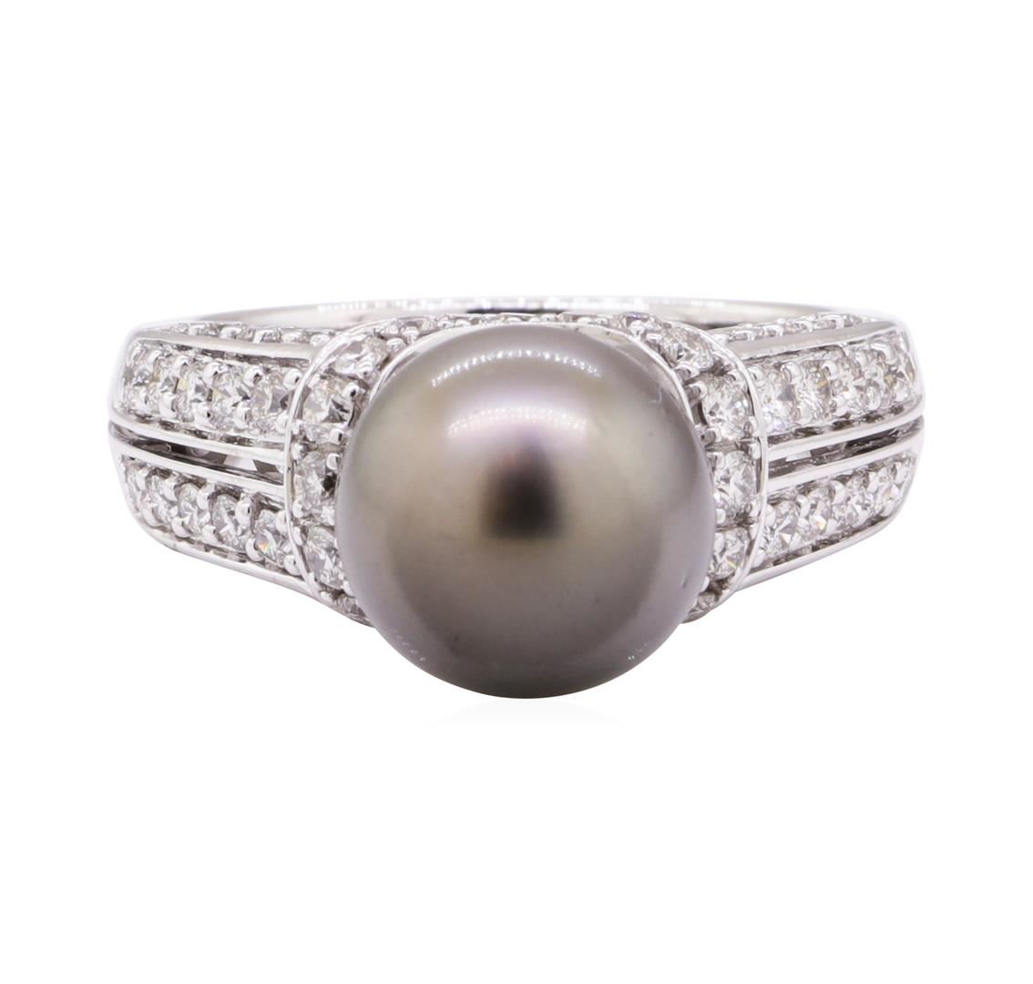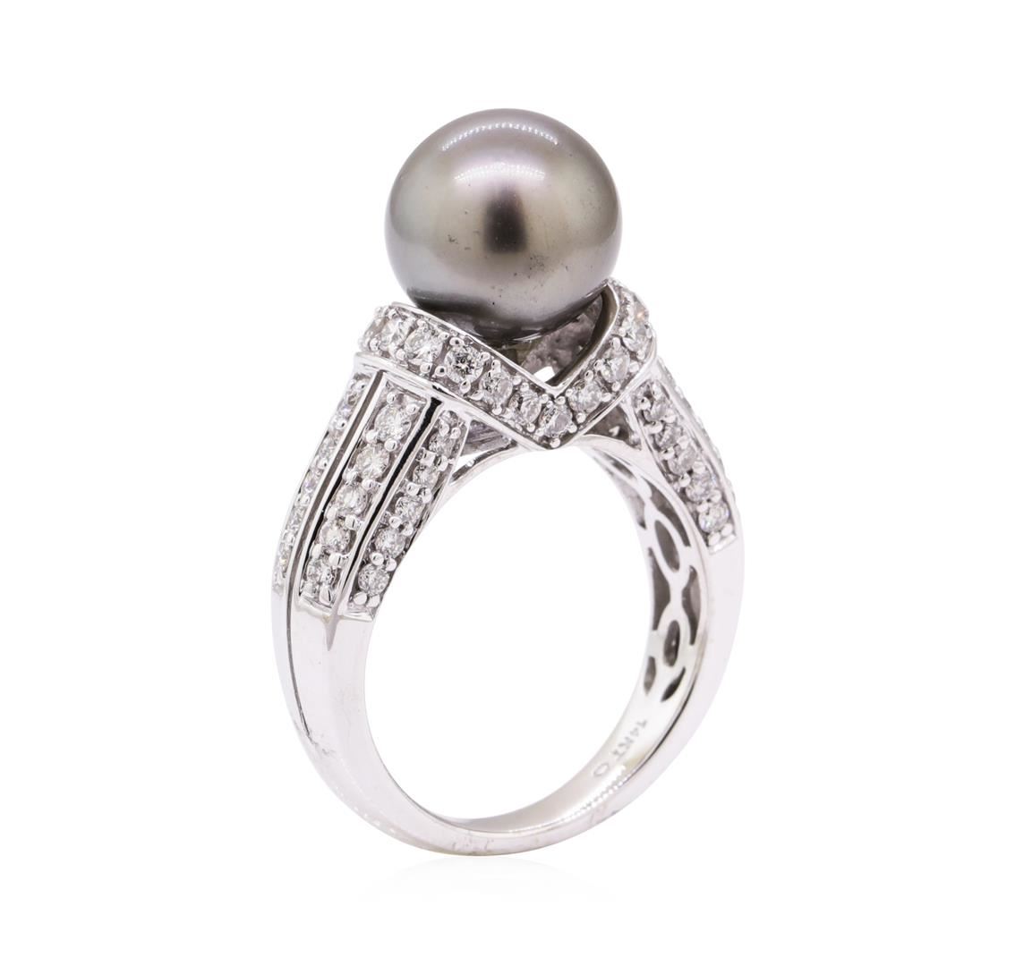 One electronically tested 14KT white gold lady's cast fashion ring with a tapered split shank with a bright polish finish. The featured lady's ring has raised diamond set shoulders and a shank measuring 3.00 millimeters wide. Identified with markings of '14K'. Condition is new, good workmanship. Containing: One Tahitian pearl, 10.2mm to 10.1mm in size. The pearl is silver in color, green overtone with a good luster, round, and clean. Graded in the setting. Twenty prong set round brilliant cut diamonds, measuring 1.70 - 1.65 x 1.04mm (depth est.) approximate total weight of 20 Stones = 0.36ct. Graded in the setting. Color H - I Clarity VS-2 to SI-1 Cut Very Good Forty prong set round brilliant cut diamonds, measuring 1.60 - 1.35 x 0.92mm (depth est.) approximate total weight of 40 Stones = 0.50ct. Graded in the setting. Color H - I Clarity VS-2 to SI-1 Cut Very Good. Total Weight of Diamonds 0.86ct.. Total Weight of Ring 7.90gm GAS Appraised at $3885.00. GAS Appraised at $3,885.00.