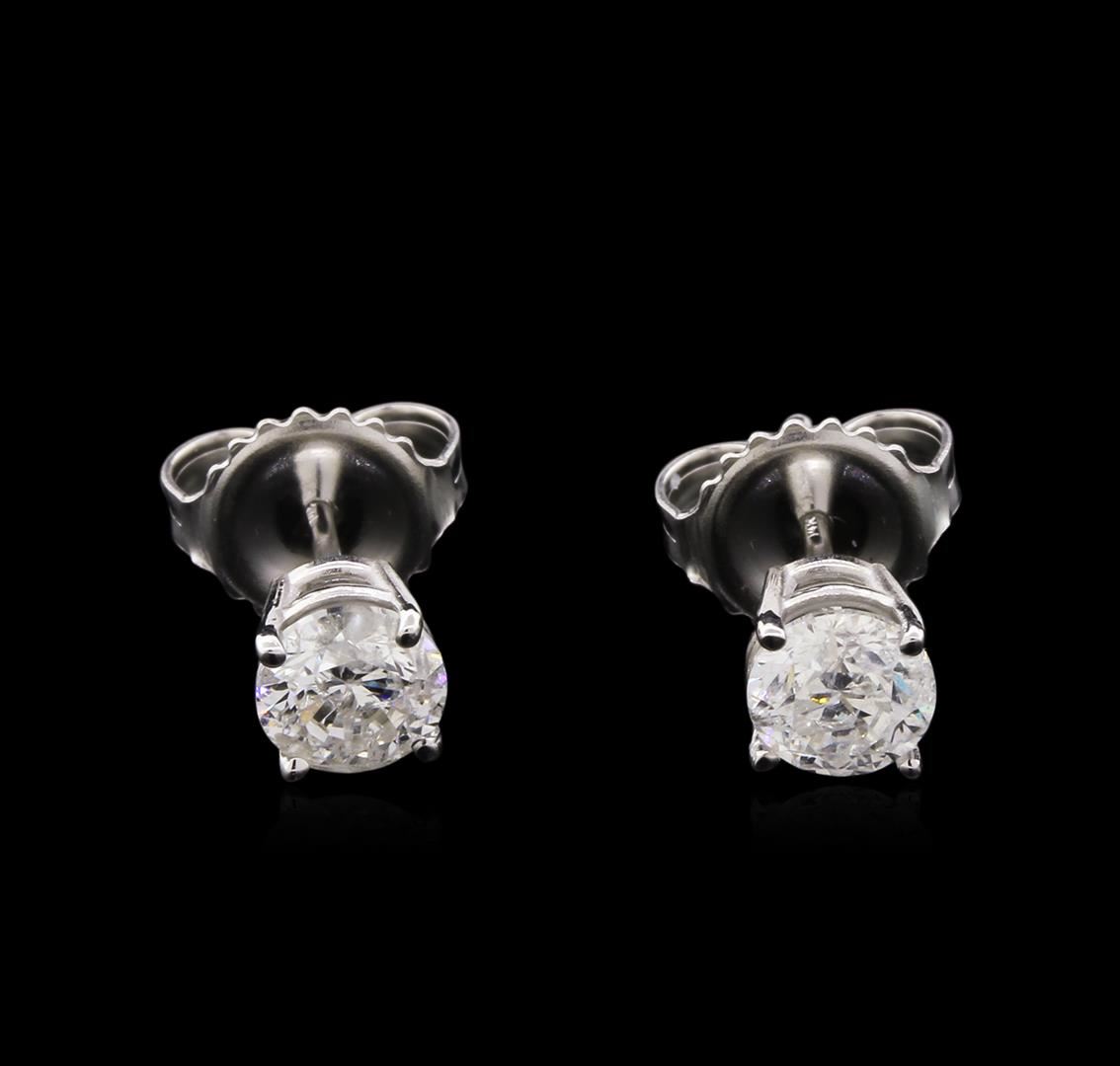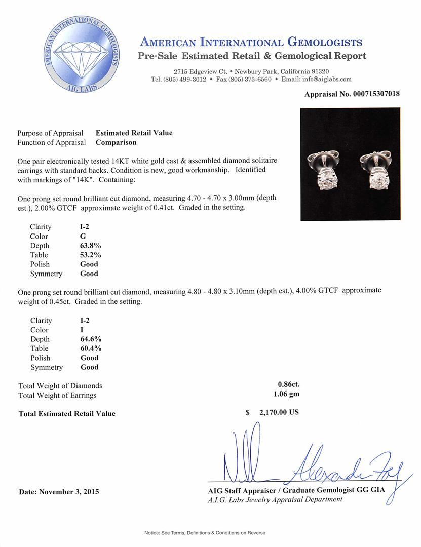 One pair electronically tested 14KT white gold cast & assembled diamond solitaire earrings with standard backs. Identified with markings of "14K". Condition is new, good workmanship. Containing: One prong set round brilliant cut diamond, measuring 4.70 - 4.70 x 3.00mm (depth est.), 2.00% GTCF approximate weight of 0.41ct. Graded in the setting. Clarity: I-2. Color: 63.8%. Table 53.2%. One prong set round brilliant cut diamond, measuring 4.80 - 4.80 x 3.10mm (depth est.), 4.00% GTCF approximate weight of 0.45ct. Graded in the setting. Clarity: I-2. Color: I. Depth 64.6%. Table 60.4%. Total Weight of Diamonds 0.86ct. Total Weight of Earrings 1.06gm. AIG Appraised at $2,170.00.