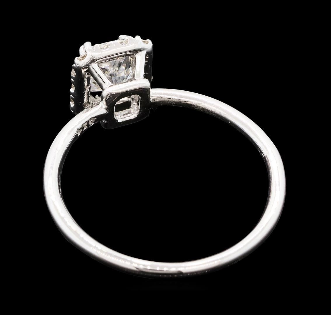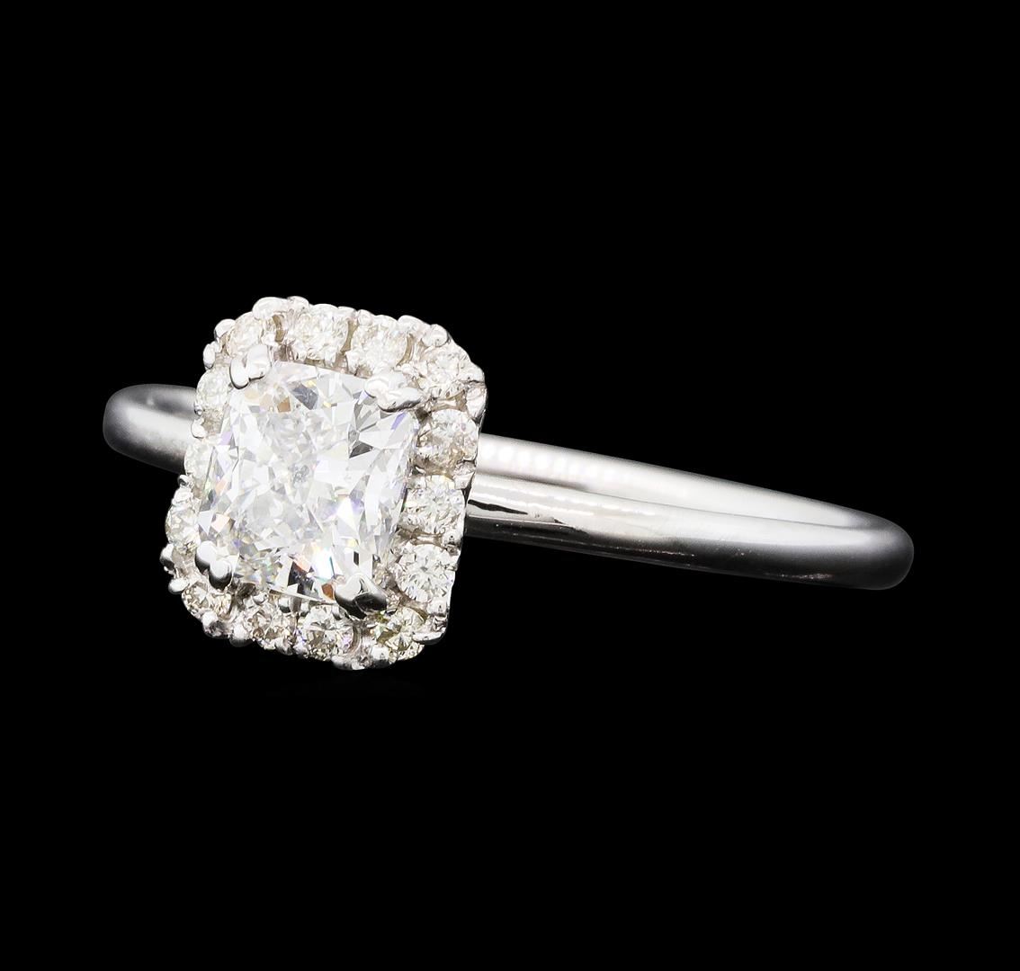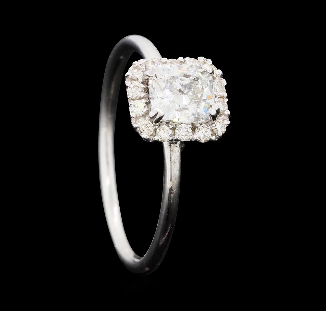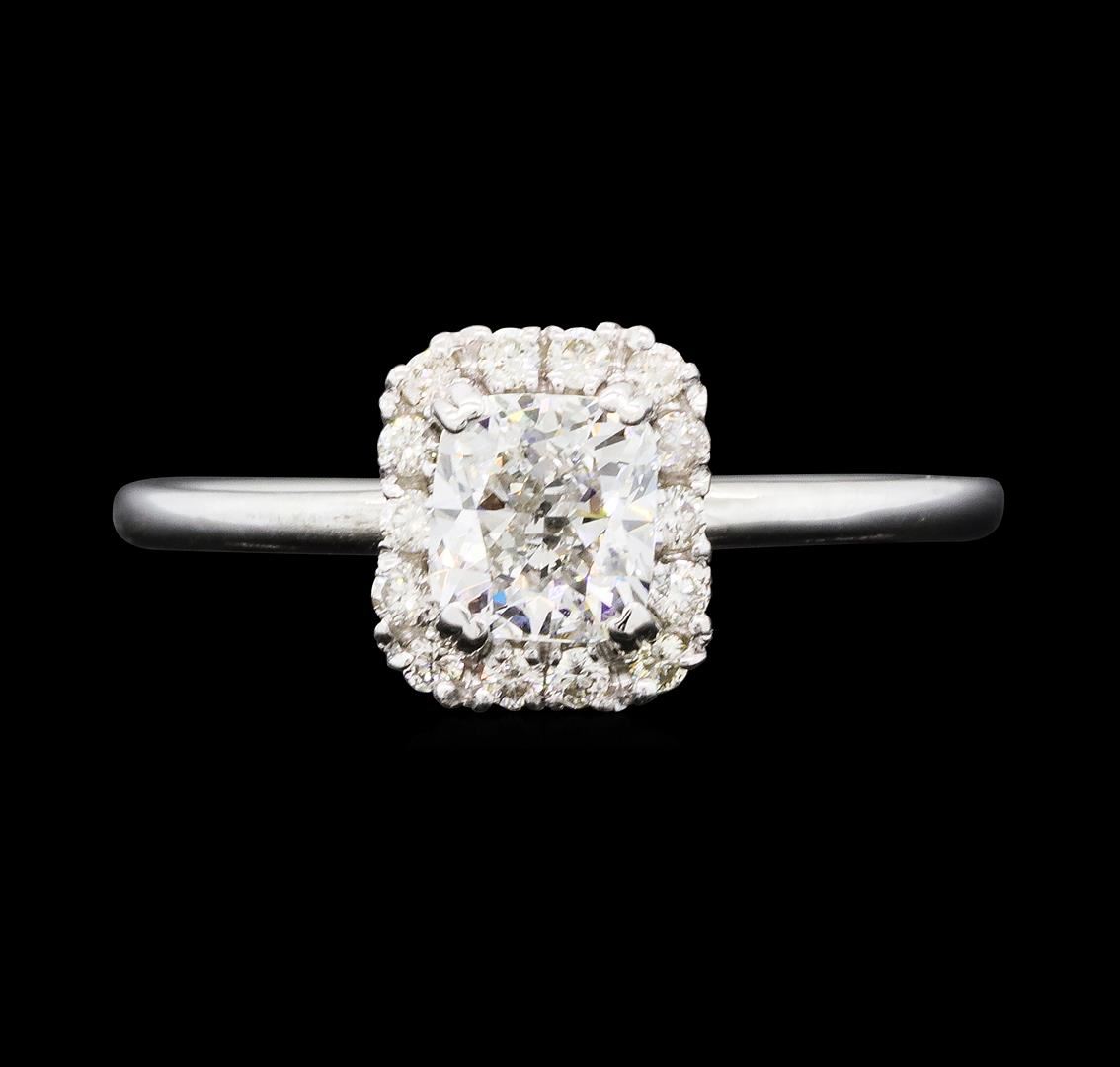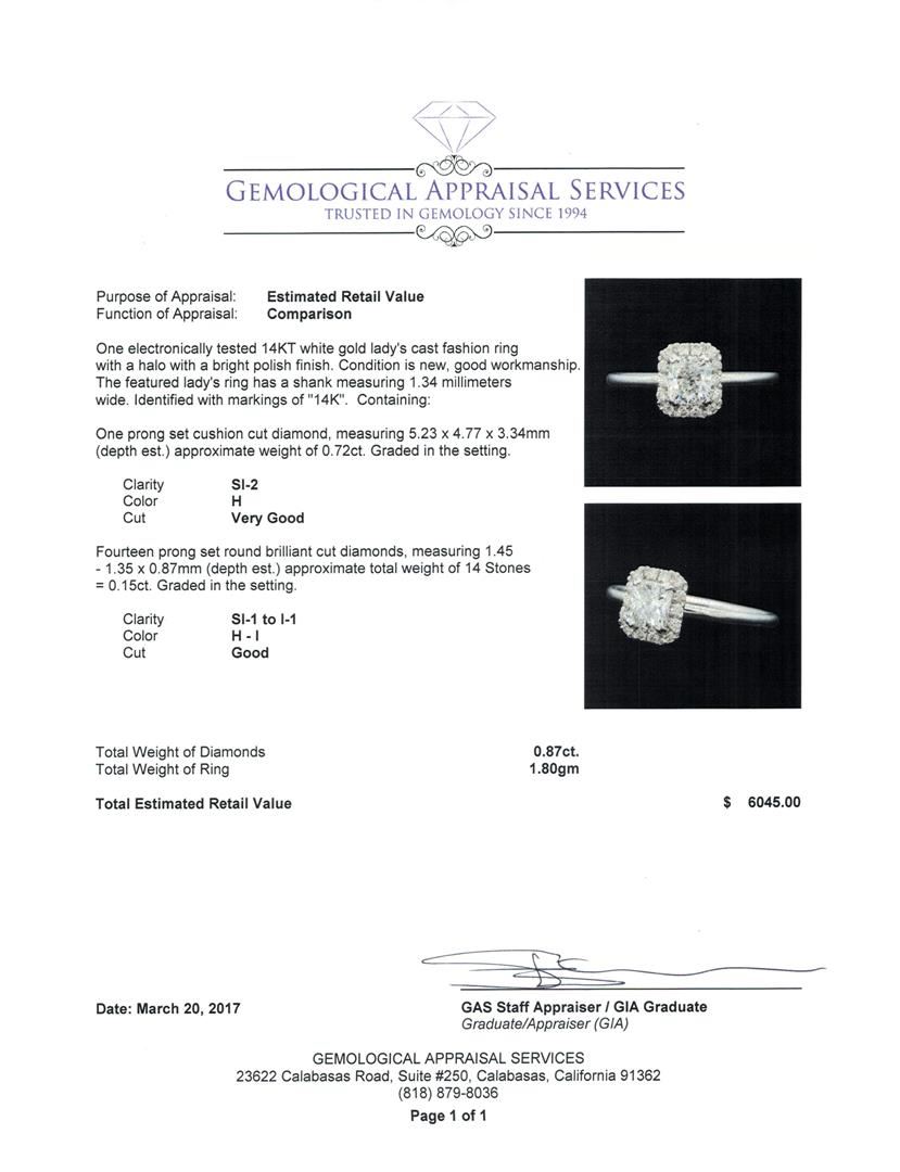 One electronically tested 14KT white gold lady's cast fashion ring with a halo with a bright polish finish. The featured lady's ring has a shank measuring 1.34 millimeters wide. Identified with markings of '14K'. Condition is new, good workmanship. Containing: One prong set cushion cut diamond, measuring 5.23 x 4.77 x 3.34mm (depth est.) approximate weight of 0.72ct. Graded in the setting. Color H Clarity SI-2 Cut Very Good Fourteen prong set round brilliant cut diamonds, measuring 1.45 - 1.35 x 0.87mm (depth est.) approximate total weight of 14 Stones = 0.15ct. Graded in the setting. Color H - I Clarity SI-1 to I-1 Cut Good. Total Weight of Diamonds 0.87ct.. Total Weight of Ring 1.80gm GAS Appraised at $6,045.00.