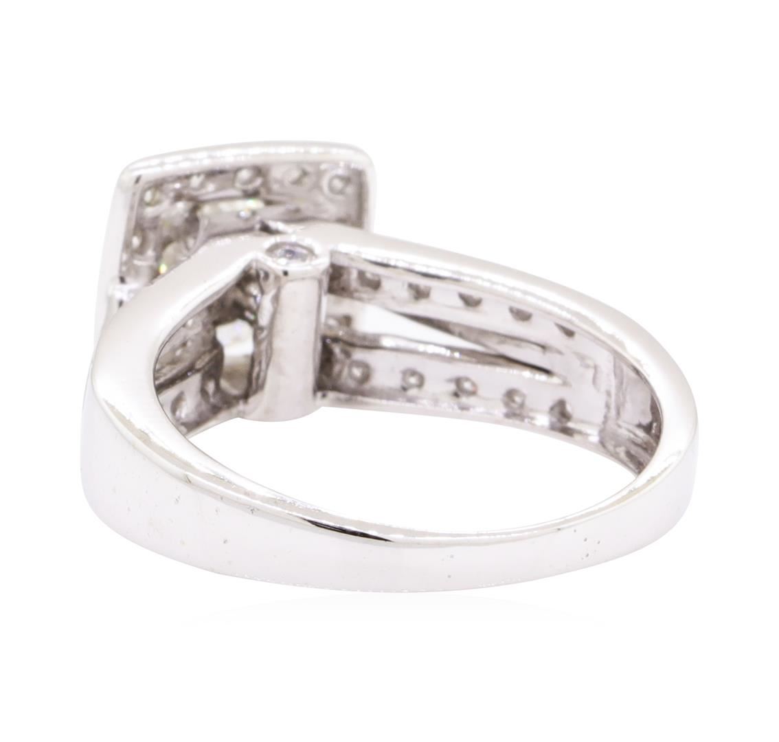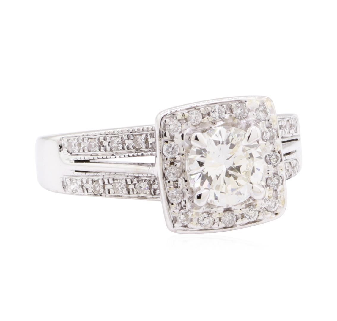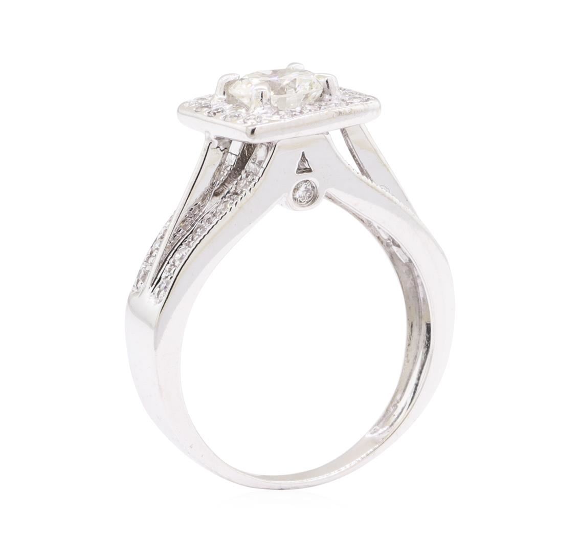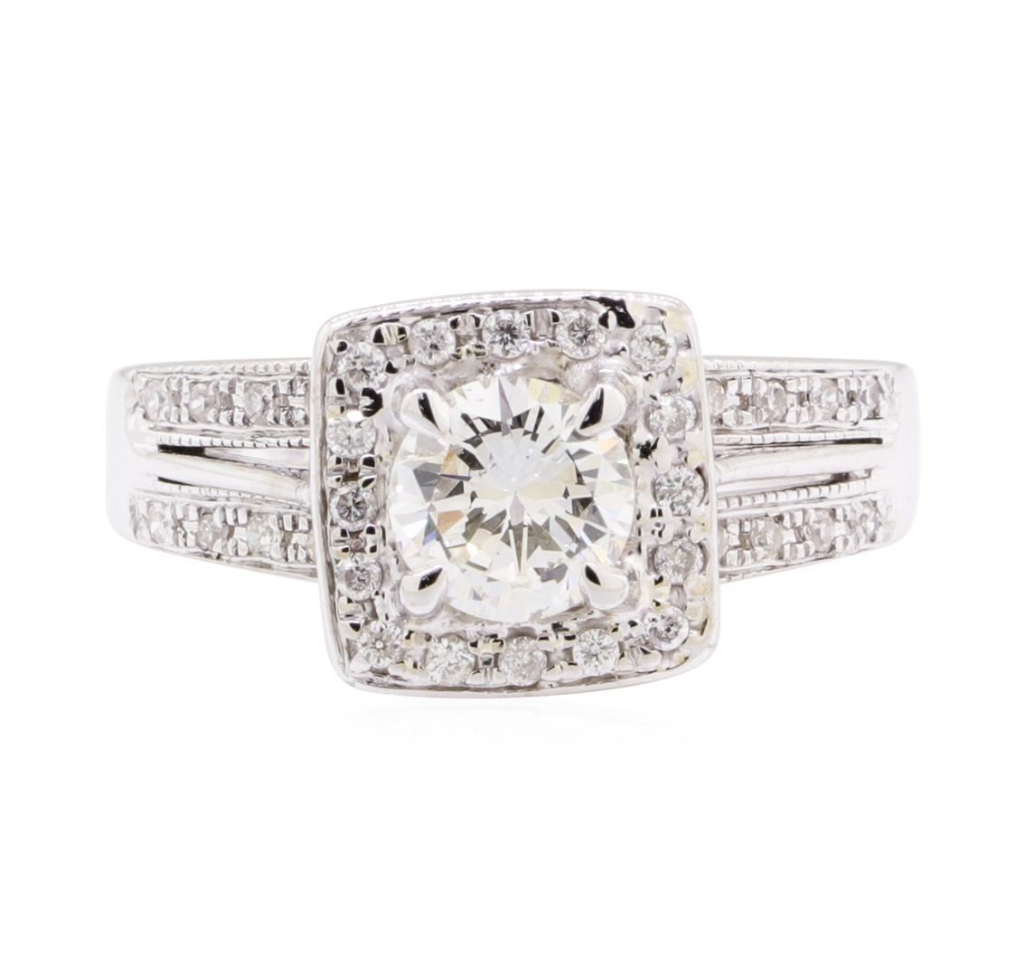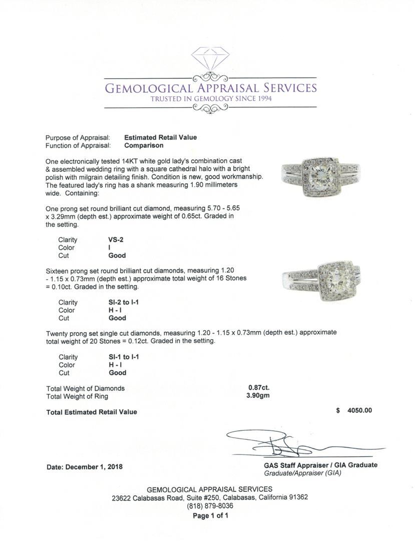One electronically tested 14KT white gold lady's combination cast & assembled wedding ring with a square cathedral halo with a bright polish with milgrain detailing finish. The featured lady's ring has a shank measuring 1.90 millimeters wide. Condition is new, good workmanship. Containing: One prong set round brilliant cut diamond, measuring 5.70 - 5.65 x 3.29mm (depth est.) approximate weight of 0.65ct. Graded in the setting. Color I Clarity VS-2 Cut Good Sixteen prong set round brilliant cut diamonds, measuring 1.20 - 1.15 x 0.73mm (depth est.) approximate total weight of 16 Stones = 0.10ct. Graded in the setting. Color H - I Clarity SI-2 to I-1 Cut Good Twenty prong set single cut diamonds, measuring 1.20 - 1.15 x 0.73mm (depth est.) approximate total weight of 20 Stones = 0.12ct. Graded in the setting. Color H - I Clarity SI-1 to I-1 Cut Good. Total Weight of Diamonds 0.87ct.. Total Weight of Ring 3.90gm GAS Appraised at $4050.00. GAS Appraised at $4,050.00.