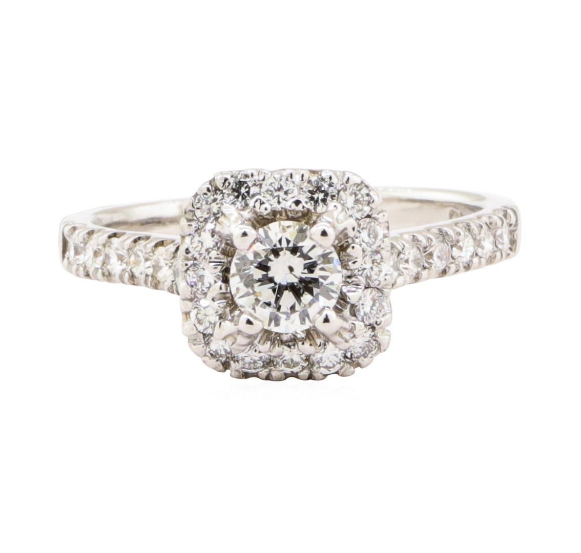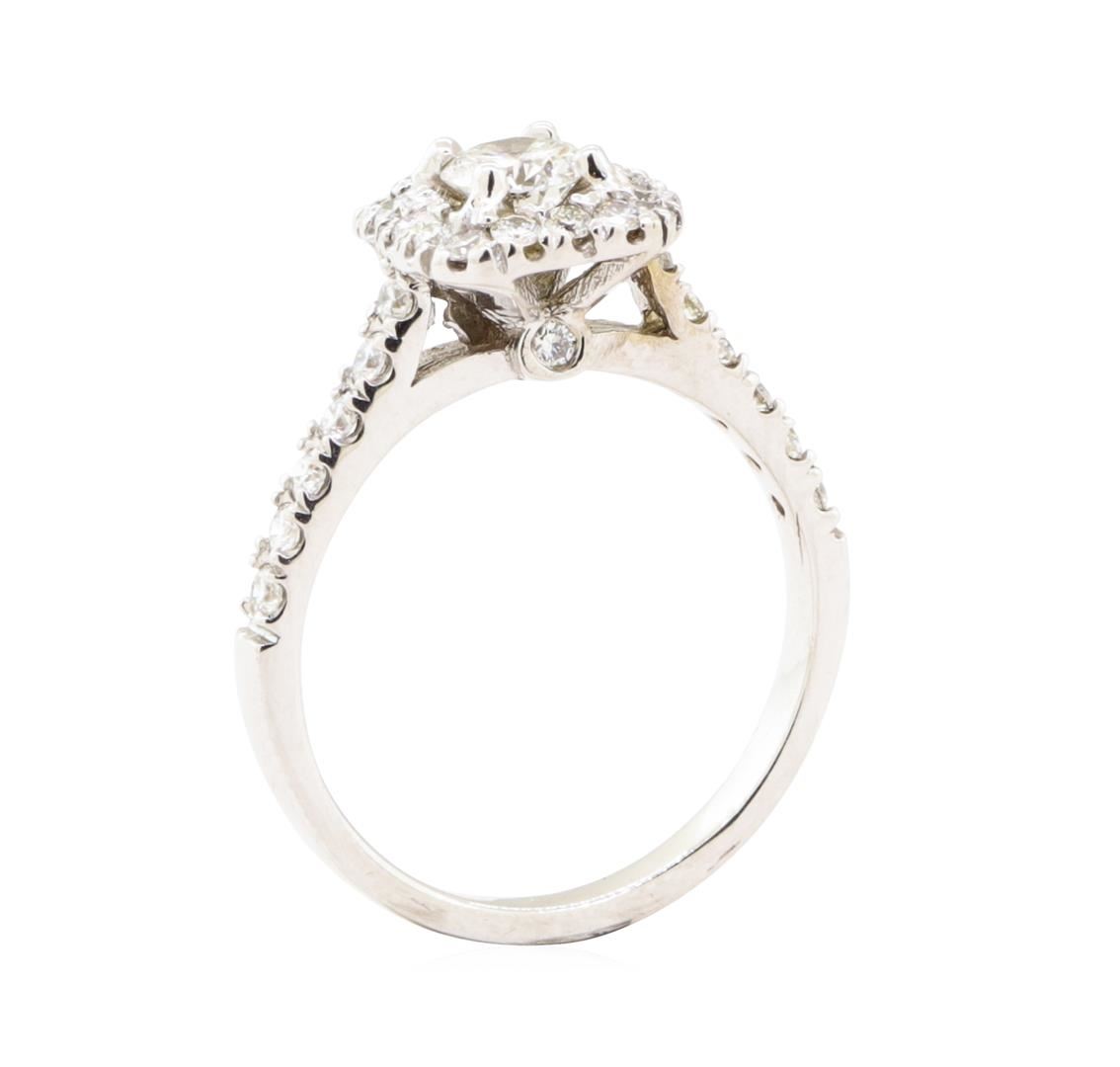 One electronically tested 14KT white gold lady's cast wedding ring with a cathedral square cushion halo with a bright polish finish. The featured lady's ring has a shank measuring approximately 2.07 millimeters in width. Trademark is MJ. Identified with m GAS Appraised.
