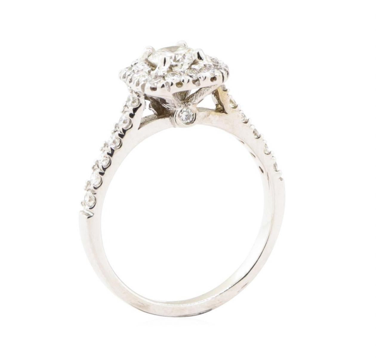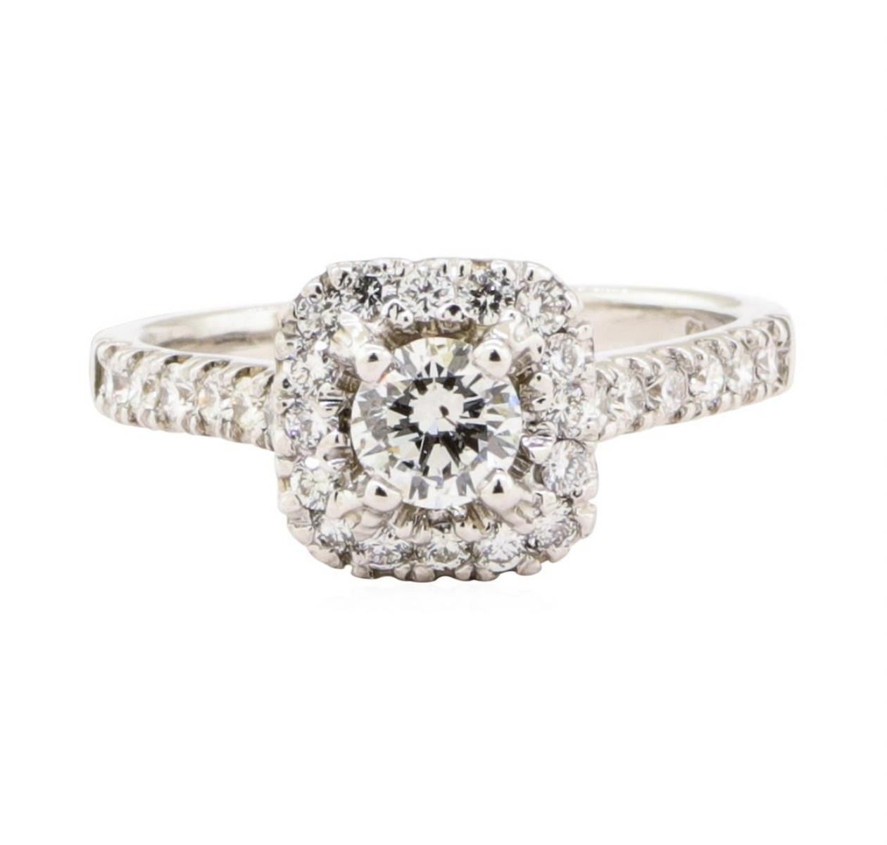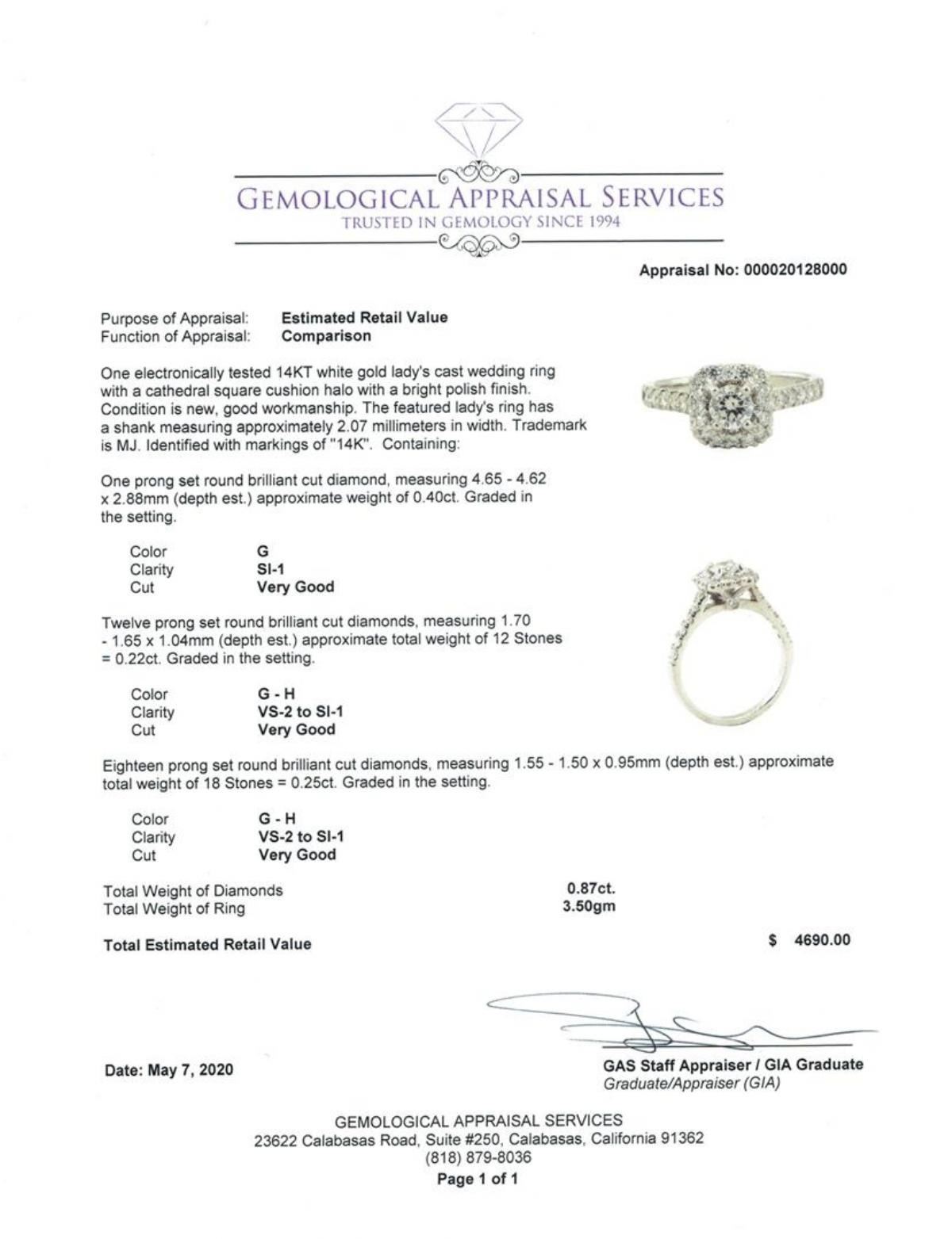 One electronically tested 14KT white gold lady's cast wedding ring with a cathedral square cushion halo with a bright polish finish. The featured lady's ring has a shank measuring approximately 2.07 millimeters in width. Trademark is MJ. Identified with markings of '14K'. Condition is new, good workmanship. Containing: One prong set round brilliant cut diamond, measuring 4.65 - 4.62 x 2.88mm (depth est.) approximate weight of 0.40 ct. Graded in the setting. Color G Clarity SI-1 Cut Very Good Twelve prong set round brilliant cut diamonds, measuring 1.70 - 1.65 x 1.04mm (depth est.) approximate total weight of 12 Stones = 0.22ct. Graded in the setting. Color G - H Clarity VS-2 to SI-1 Cut Very Good Eighteen prong set round brilliant cut diamonds, measuring 1.55 - 1.50 x 0.95mm (depth est.) approximate total weight of 18 Stones = 0.25ct. Graded in the setting. Color G - H Clarity VS-2 to SI-1 Cut Very Good. Total Weight of Diamonds 0.87ct.. Total Weight of Ring 3.50gm GAS Appraised at $4690.00. GAS Appraised.