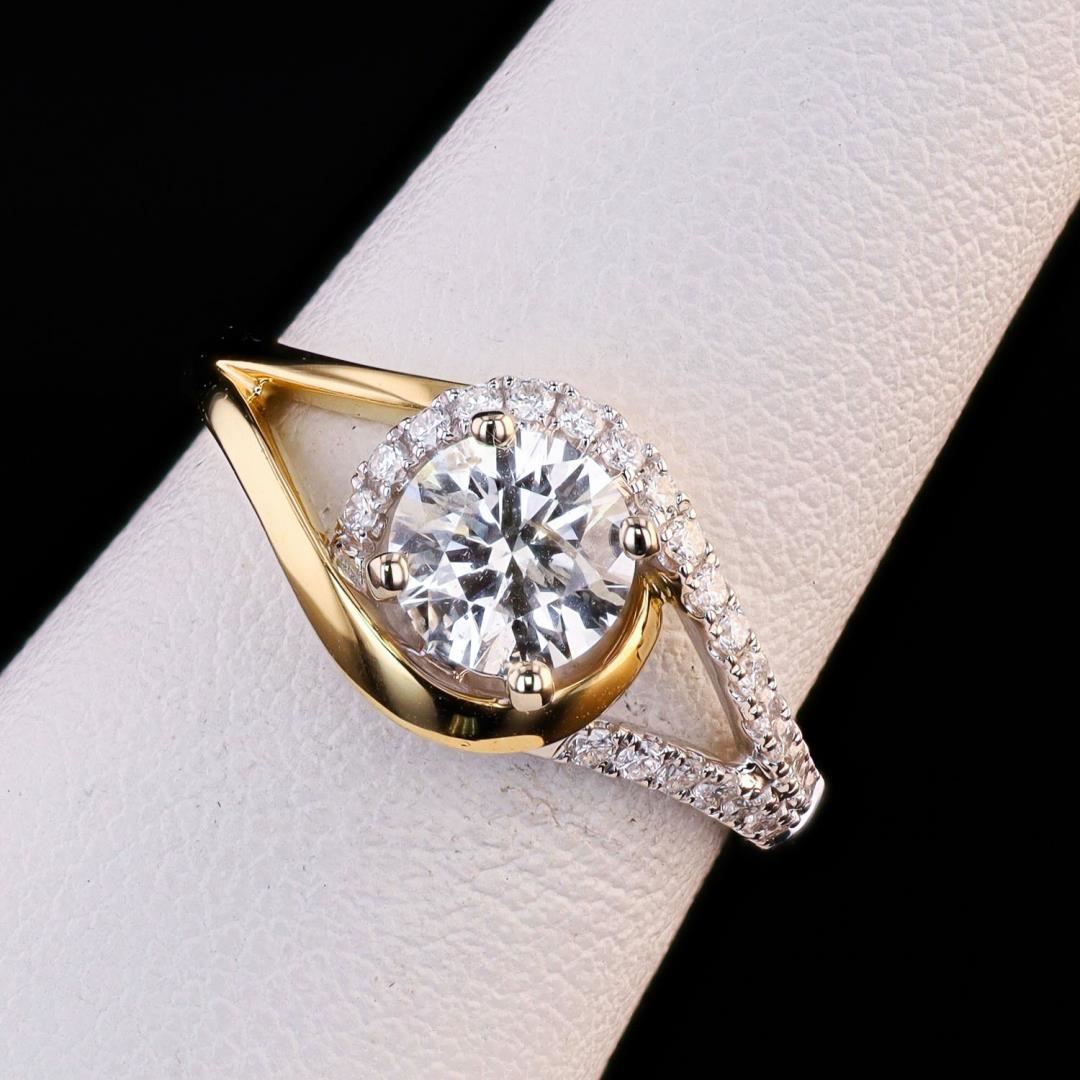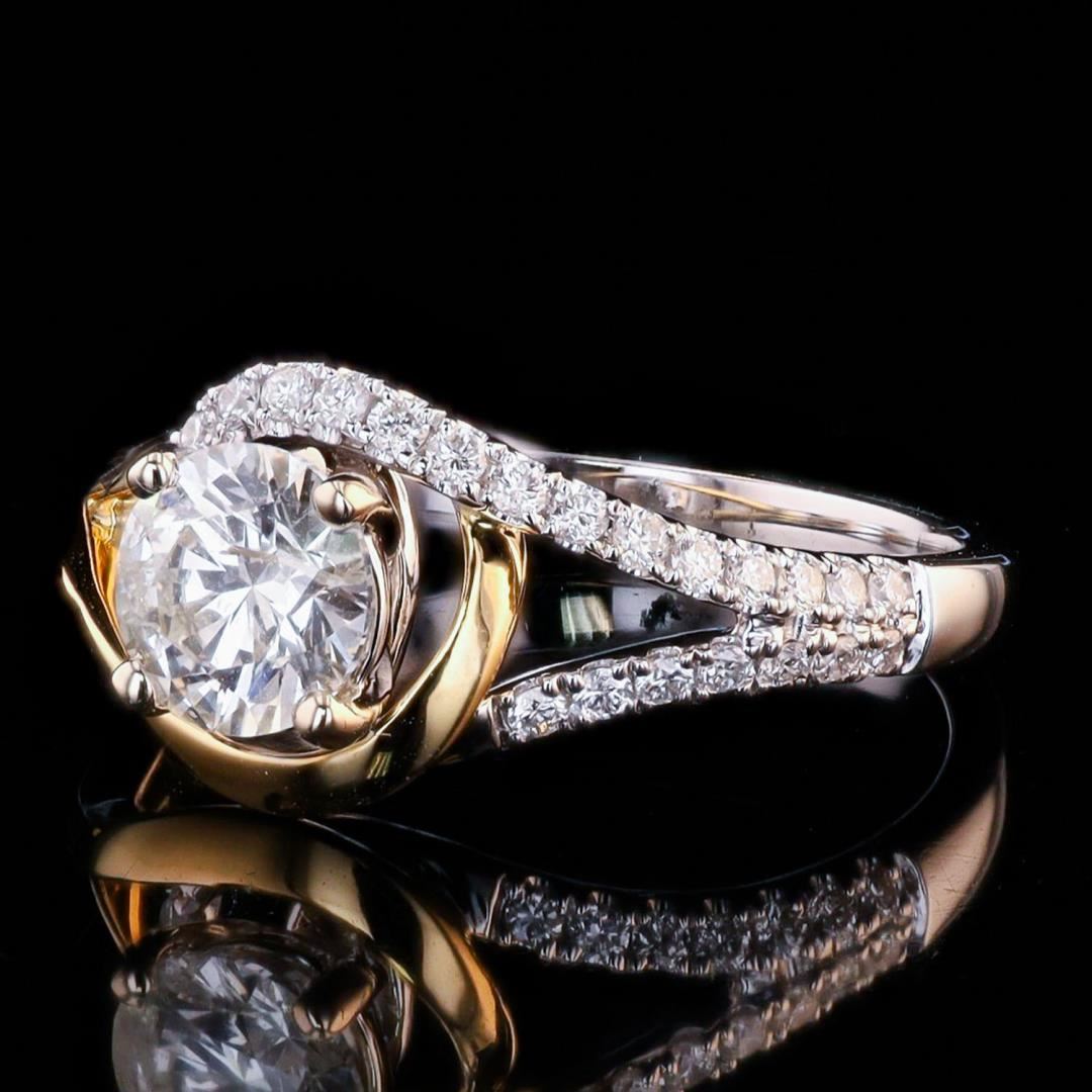 One polished, stamped, and tested 18K yellow and white gold ring marked HANA. The ring is mounted with: 1 genuine diamond center stone weighing approximately 0.87 carat, and 24 genuine round diamonds weighing approximately 0.21 carats. This item weighs 4.2 grams, condition is new, excellent workmanship. #MAIN GEMSTONE# Identity: Natural Diamond; Shape: Round; Cutting Style: Brilliant Cut; Average Diameter: 6.1mm; Weight: 0.87 carat; Color Grade: F; Clarity Grade: I1; Cut Grade: Very Good; Refractive Index: 2.417; Hardness: 10 #ADJACENT GEMSTONES ON RING# Identity: Natural Diamond; Shape: Round; Cutting Style: Brilliant Cut; Quantity: 24 Diamonds; Average Diameter: 1.2mm; Total Weight: 0.21 carats; Color Grade: F-G; Clarity Grade: SI1-SI2; Refractive Index: 2.417; Hardness: 10 #CENTER DIAMOND WEIGHT: 0.87 ct; TOTAL DIAMOND WEIGHT: 1.08 cts; WEIGHT OF ITEM: 4.2 grams; GOLD CONTENT: 18K Yellow & White Gold #Size: 6 1/2