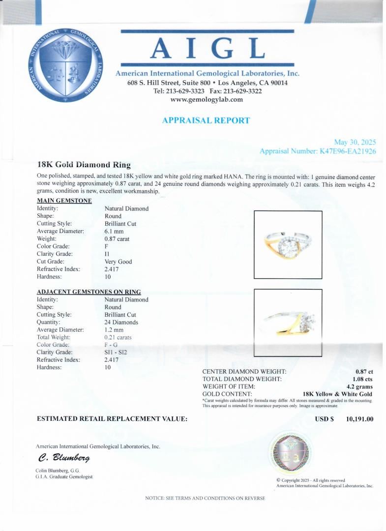 One polished, stamped, and tested 18K yellow and white gold ring marked HANA. The ring is mounted with: 1 genuine diamond center stone weighing approximately 0.87 carat, and 24 genuine round diamonds weighing approximately 0.21 carats. This item weighs 4.2 grams, condition is new, excellent workmanship. #MAIN GEMSTONE# Identity: Natural Diamond; Shape: Round; Cutting Style: Brilliant Cut; Average Diameter: 6.1mm; Weight: 0.87 carat; Color Grade: F; Clarity Grade: I1; Cut Grade: Very Good; Refractive Index: 2.417; Hardness: 10 #ADJACENT GEMSTONES ON RING# Identity: Natural Diamond; Shape: Round; Cutting Style: Brilliant Cut; Quantity: 24 Diamonds; Average Diameter: 1.2mm; Total Weight: 0.21 carats; Color Grade: F-G; Clarity Grade: SI1-SI2; Refractive Index: 2.417; Hardness: 10 #CENTER DIAMOND WEIGHT: 0.87 ct; TOTAL DIAMOND WEIGHT: 1.08 cts; WEIGHT OF ITEM: 4.2 grams; GOLD CONTENT: 18K Yellow & White Gold #Size: 6 1/2