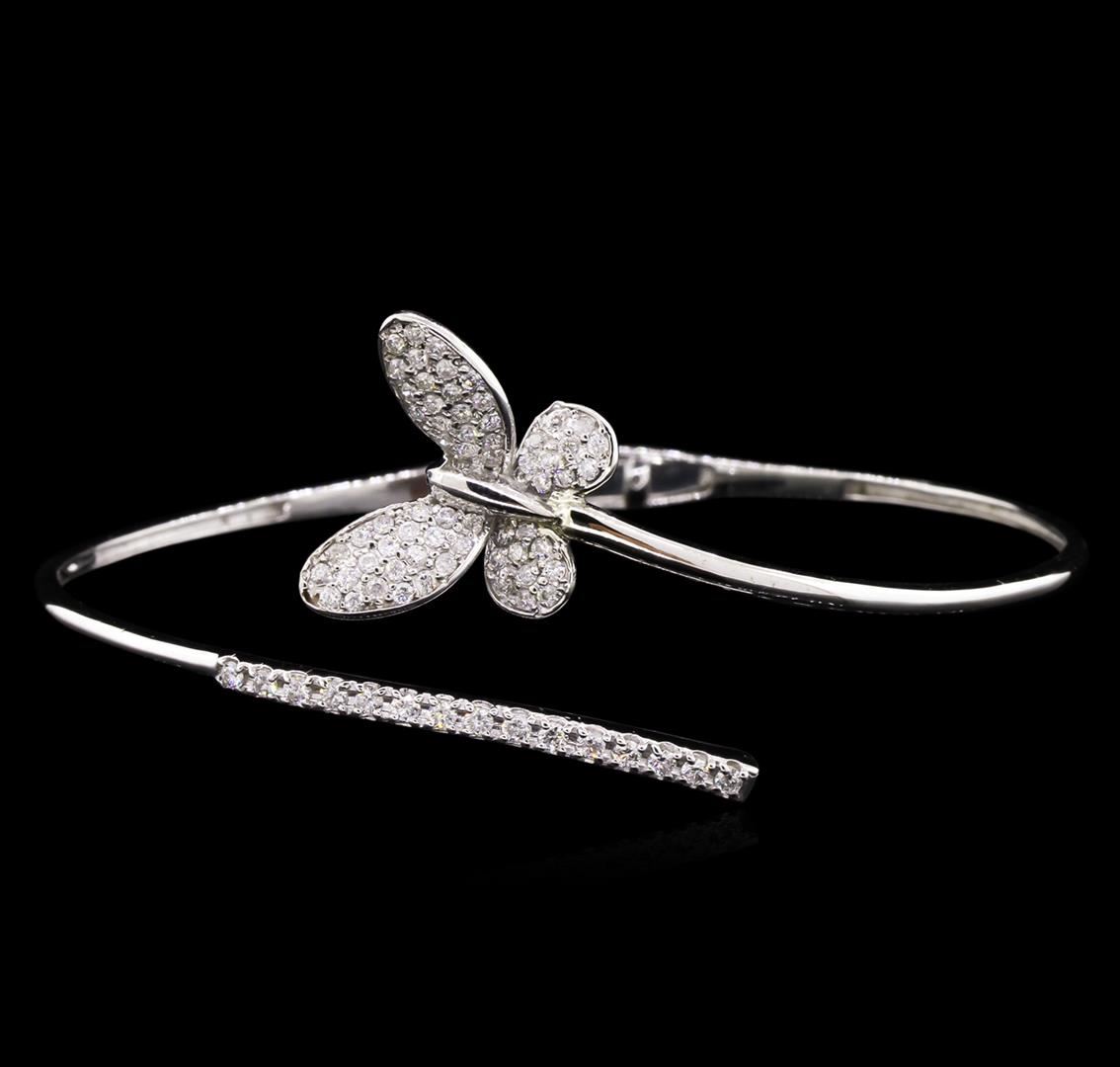 One electronically tested 14KT white lady's combination cast & assembled bangle bracelet with a hinged clasp with a bright polish finish. The featured ladies bracelet has a bypass butterfly motif and measures 6.5 inches in length. Identified with markings of "K14". Condition is new, good workmanship. Containing: Fifteen prong set round brilliant cut diamonds, measuring 1.80 - 1.70 x 1.14mm (depth est.) approximate total weight of 15 Stones = 0.32ct. Graded in the setting. Clarity: VS-2 to SI-1. Color: G - H. Cut Good Sixty-Two pave' set round brilliant cut diamonds, measuring 1.40 - 1.30 x 0.81mm (depth est.) approximate total weight of 62 Stones = 0.56ct. Graded in the setting. Clarity: SI-2 to I-1. Color: H - I. Cut Good. Total Weight of Diamonds 0.88ct. Total Weight of Bracelet 9.90gm. GAS Appraised at $4,435.00.
