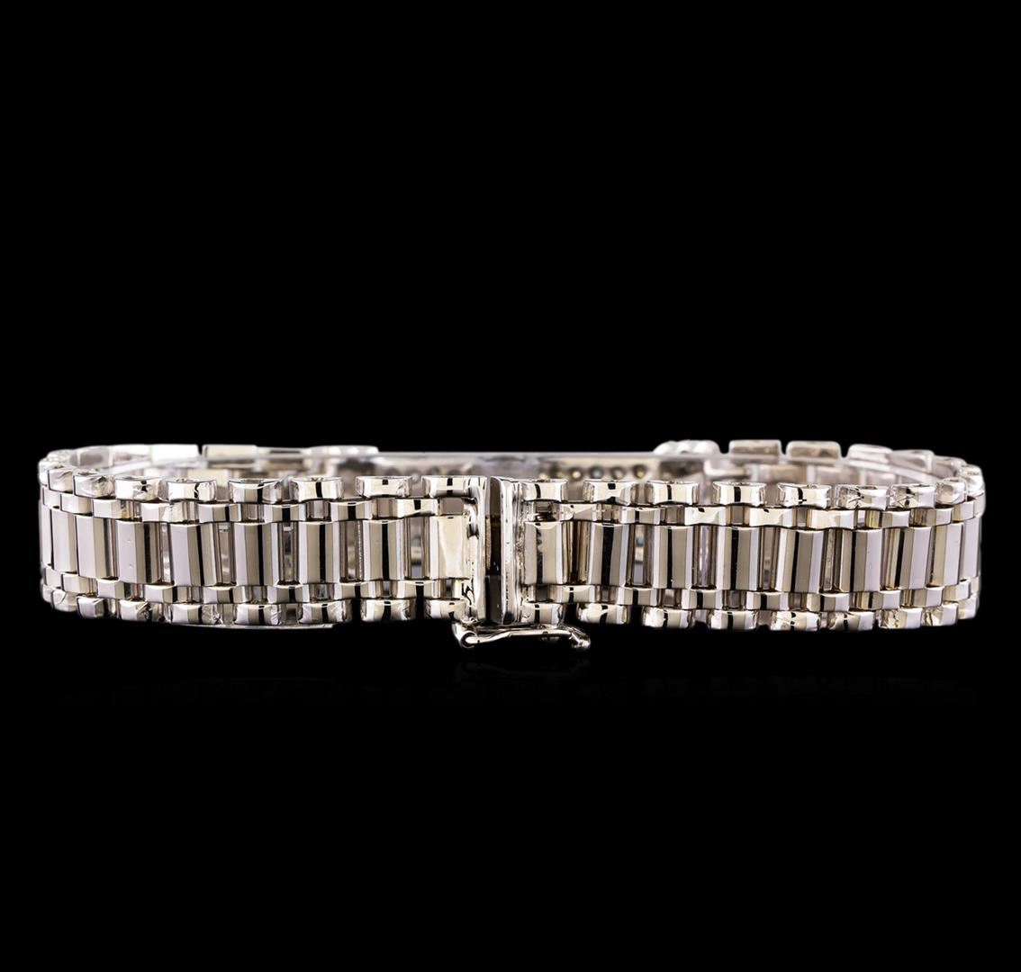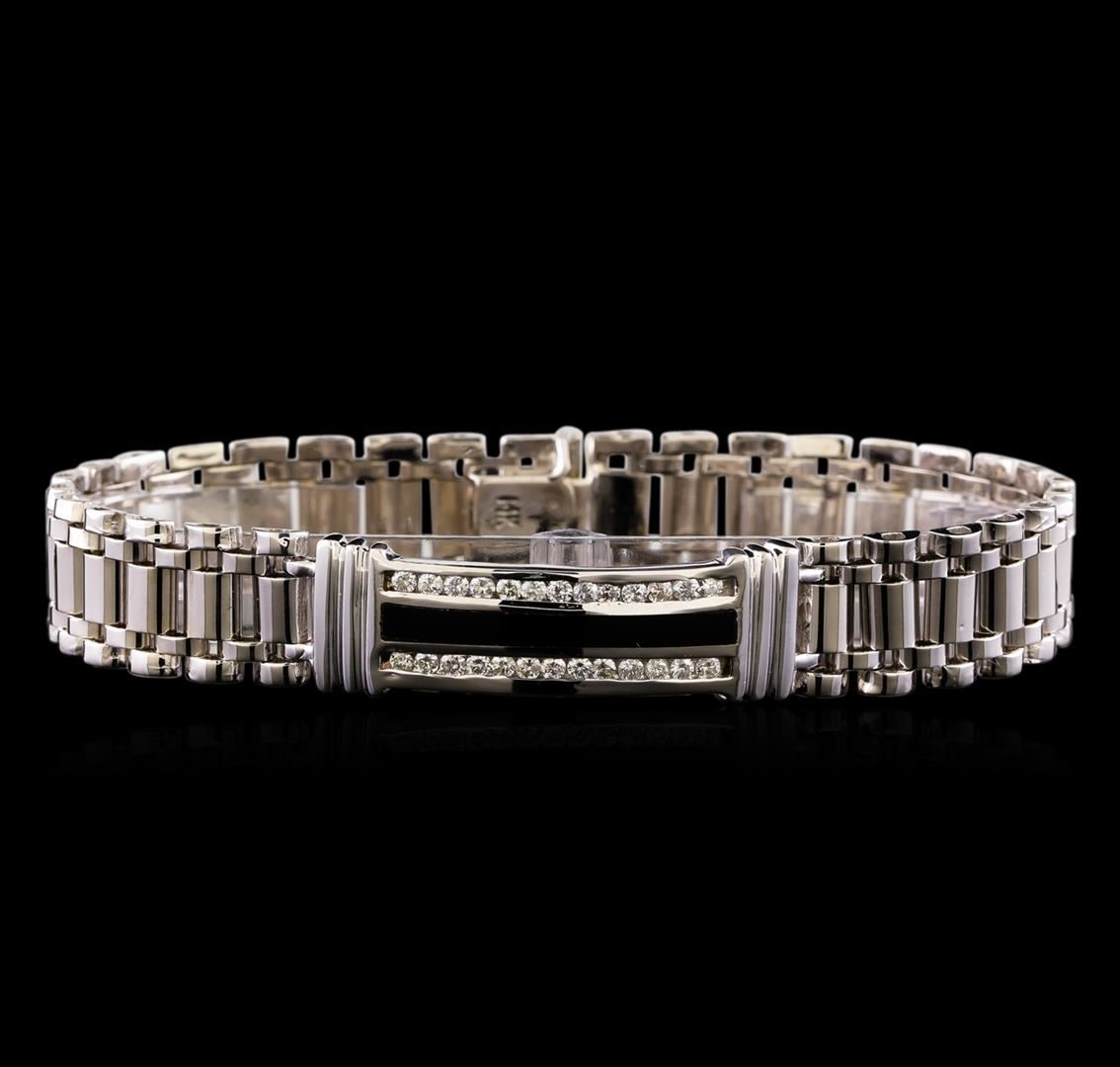 One electronically tested 14KT white gold man's combination cast & assembled fashion bracelet with a tongue clasp with foldover safety with a bright polish finish. The featured man's bracelet has an inlaid rectangular cut onyx measuring 28mm wide by 3mm thick, a watch band link motif and measures 8 inches in length. Identified with markings of '14K'. Condition is new, good workmanship. Containing: Twenty-Six channel set round brilliant cut diamonds, measuring 2.10 - 2.05 x 1.29mm (depth est.) approximate total weight of 26 Stones = 0.88ct. Graded in the setting. Clarity SI-1 to SI-2. Color: H - I Cut Good. Total Weight of Diamonds 0.88ct.. Total Weight of Bracelet 41.90gm. GAS Appraised at $9,495.00.