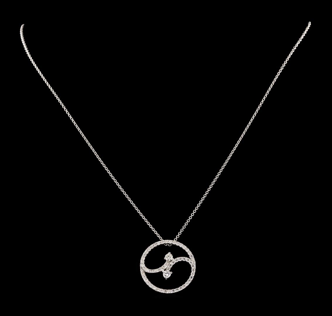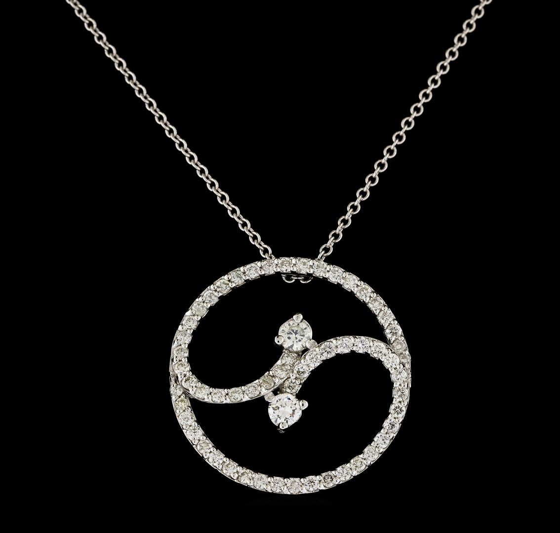 One Diamond Pendant with Chain featuring: 14KT White Gold with a total weight of 3.05 grams, Two Diamonds with a total weight of 0.20ctw, and 58 Diamonds with a total weight of 0.68ctw.