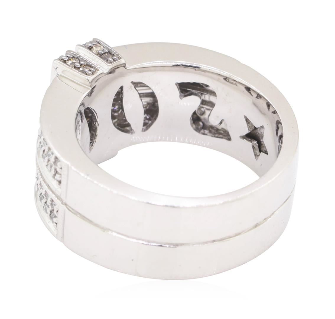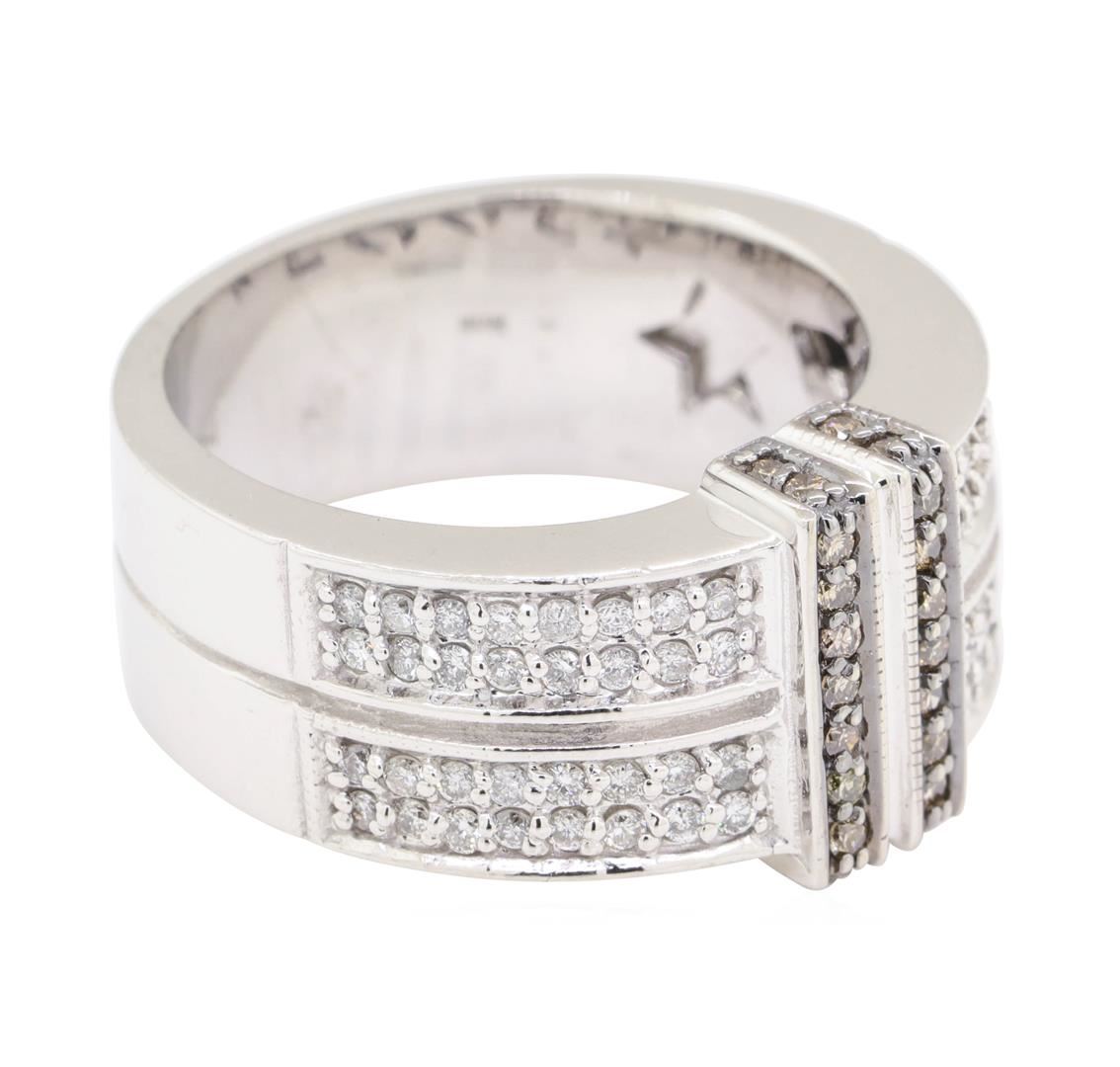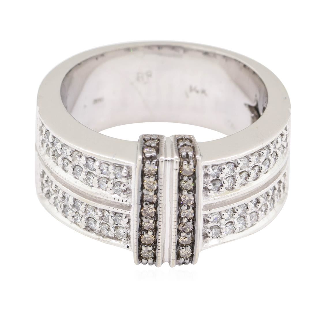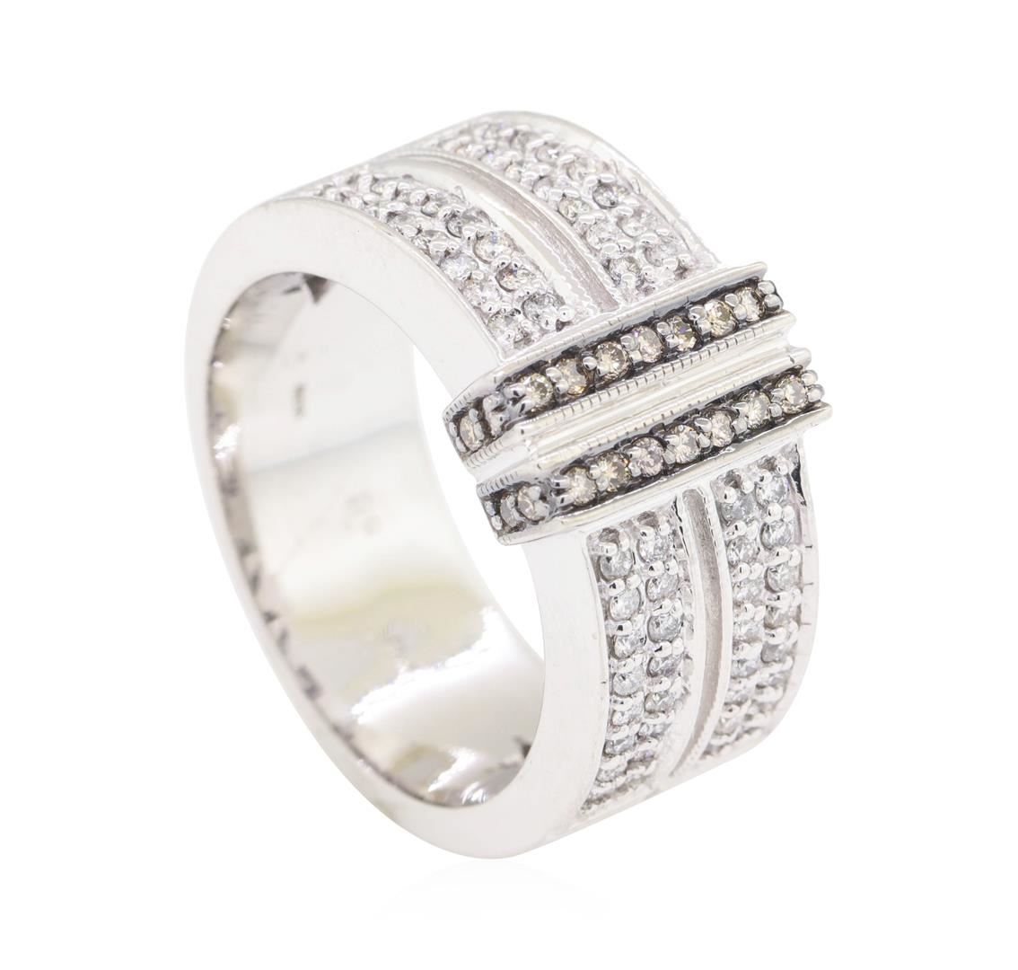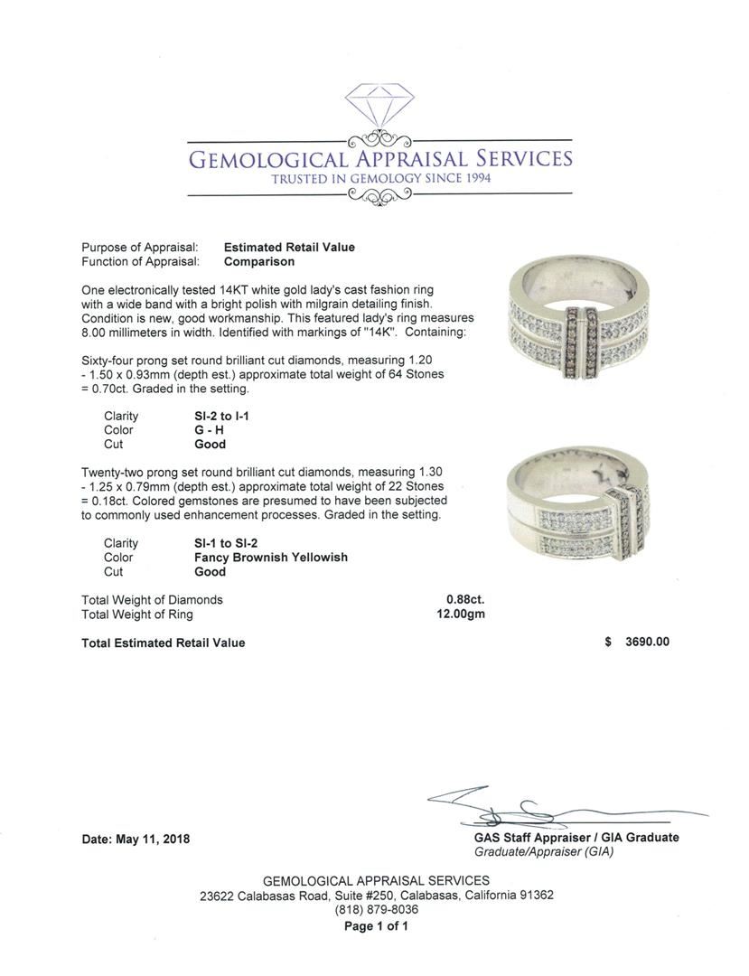 One electronically tested 14KT white gold lady's cast fashion ring with a wide band with a bright polish with milgrain detailing finish. This featured lady's ring measures 8.00 millimeters in width. Identified with markings of '14K'. Condition is new, good workmanship. Containing: Sixty-Four prong set round brilliant cut diamonds, measuring 1.20 - 1.50 x 0.93mm (depth est.) approximate total weight of 64 Stones = 0.70ct. Graded in the setting. Color G - H Clarity SI-2 to I-1 Cut Good Twenty-Two prong set round brilliant cut diamonds, measuring 1.30 - 1.25 x 0.79mm (depth est.) approximate total weight of 22 Stones = 0.18ct. Colored gemstones are presumed to have been subjected to commonly used enhancement processes. Graded in the setting. Color Fancy Brownish Yellowish Clarity SI-1 to SI-2 Cut Good. Total Weight of Diamonds 0.88ct.. Total Weight of Ring 12.00gm GAS Appraised at $3690.00. GAS Appraised at $3,690.00.