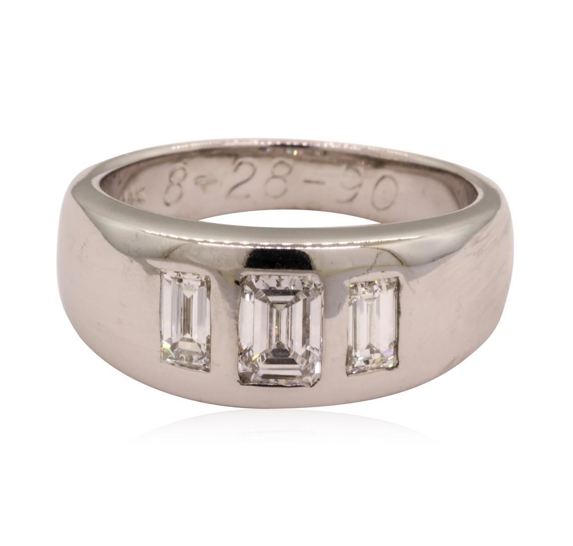 One electronically tested 14KT white gold lady's cast fashion ring with a tapered shank with a bright polish finish. The featured lady's ring has three stone motif and a shank measuring 3.45 millimeters wide. Identified with markings of '14K'. Condition is like new, good workmanship. Containing: One bezel set emerald cut diamond, measuring 5.40 x 3.65 x 2.35mm (depth est.) approximate weight of 0.43ct. Graded in the setting. Color G Clarity VS-2 Cut Very Good Two bezel set baguette cut diamonds, measuring 4.30 x 2.60 x 2.21mm (depth est.) approximate total weight of 2 Stones = 0.45ct. Graded in the setting. Color H - I Clarity VS-1 Cut Very Good. Total Weight of Diamonds 0.88ct.. Total Weight of Ring 6.70gm GAS Appraised at $4295.00. GAS Appraised at $4,295.00.