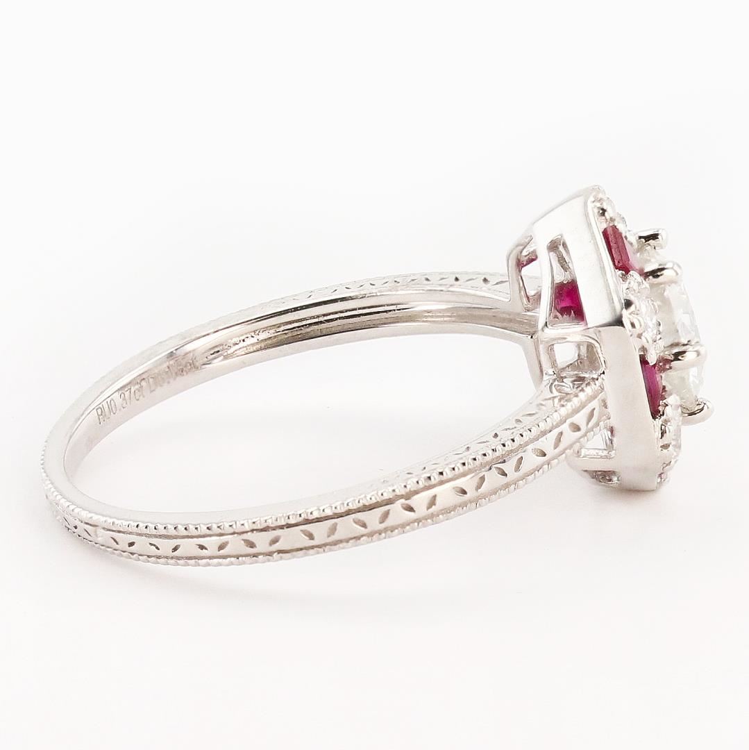 Description of Article: Ruby and Diamond Ring #Diamonds# Carat: 0.88 TCW Approx. Cut: Round Cut Color: H-I Clarity: SI-I #Ruby# Carat: 0.37 CT. Approx. Cut: Rectangular Cut Color: Red Quality: AAA #Additional Info.# Metal Purity: Platinum #LREF-3719
