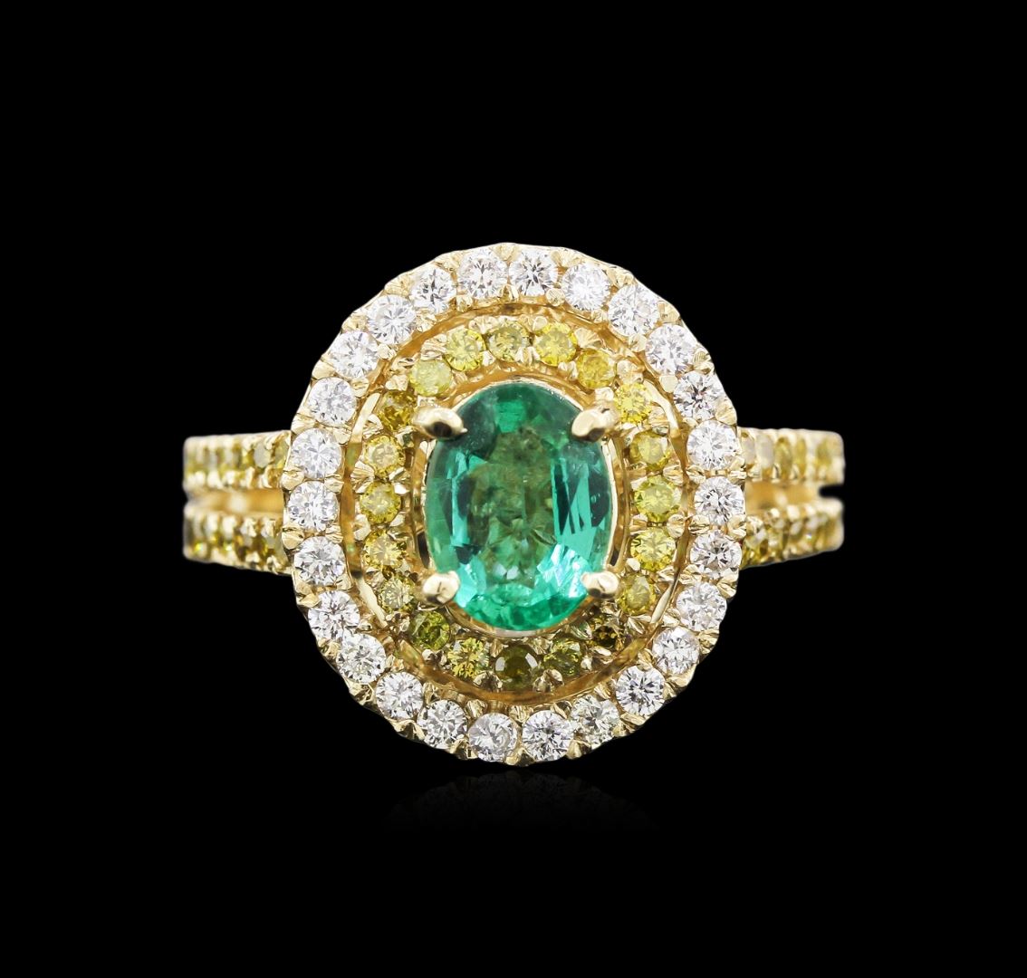 One ring featuring: 14KT yellow gold weighing 7.10 grams containing one emerald center stone with a total weight of 0.88ct and 74 white and yellow diamonds with a total weight of 0.90ct.