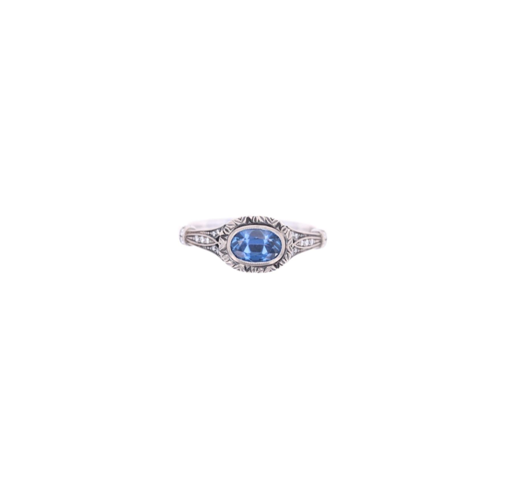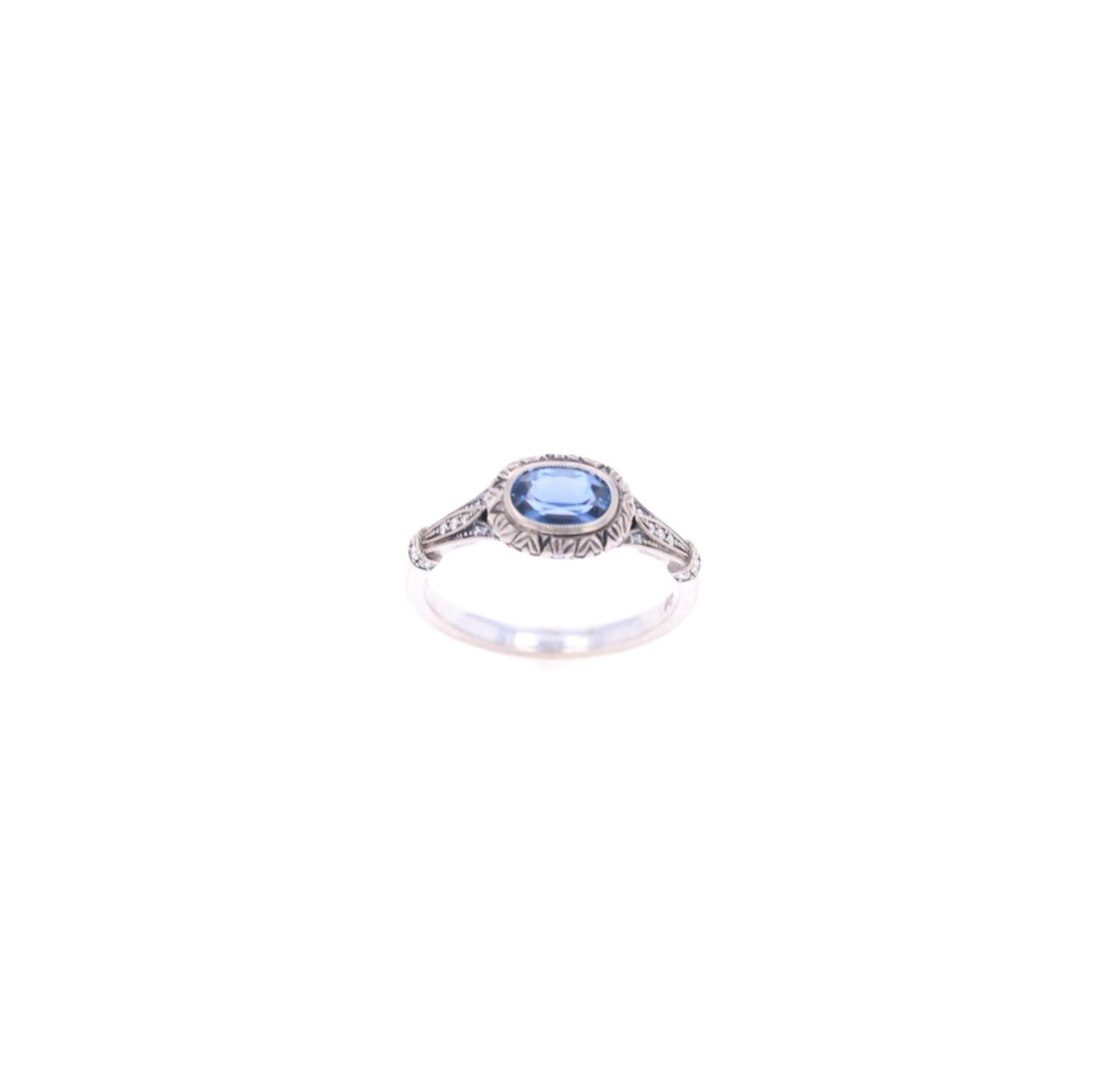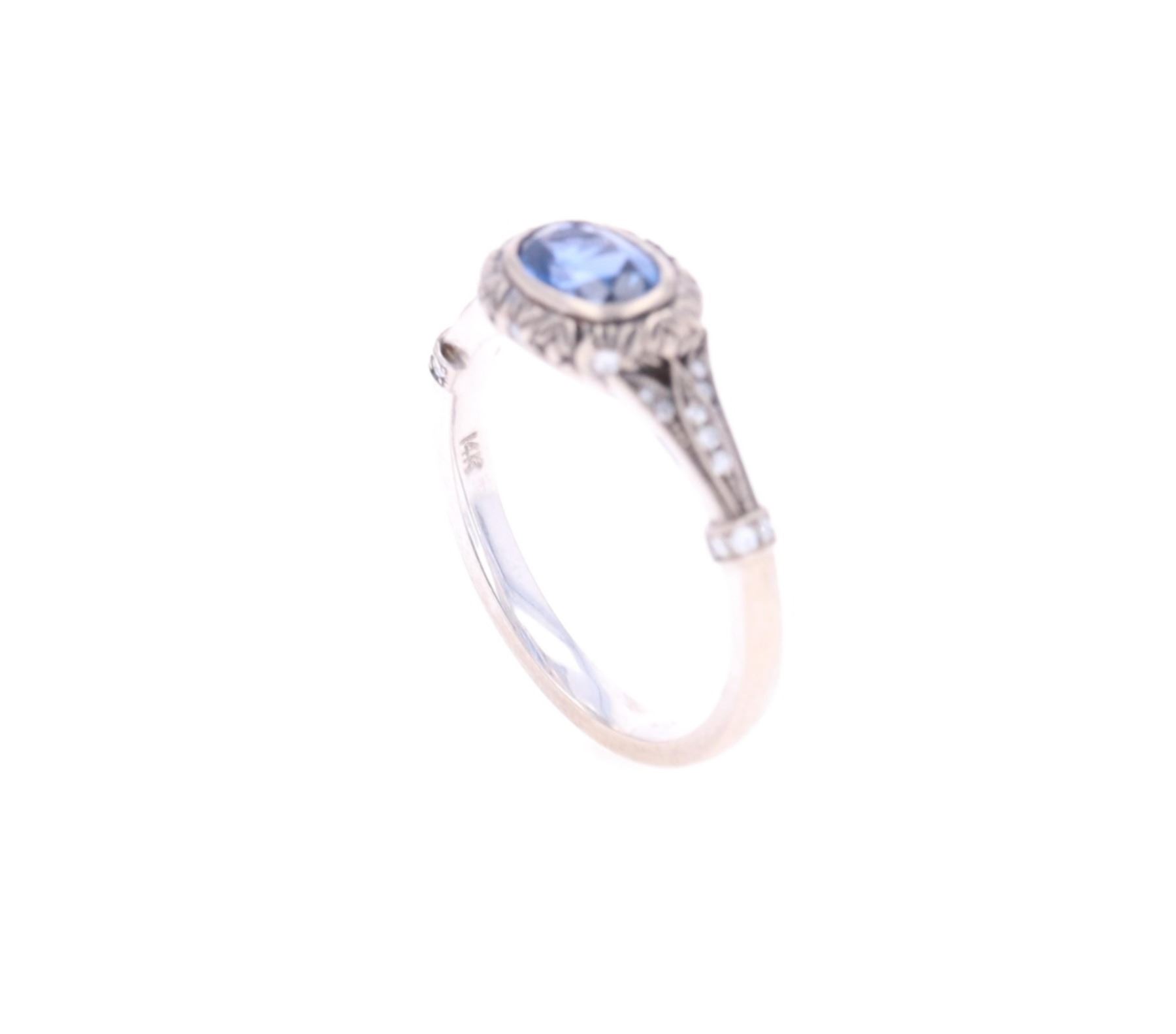 Featured in this lot is this 0.88ct Montana Yogo Sapphire diamond 14k gold ring with Gem Gallery paperwork. The ring features a wonderfully and professionally crafted 14k white gold construction that is marked as follows: GM - 14k. The ring features a oval cut Montana Yogo Sapphire that shows measurements of 6.98 x 4.69 x 3.16mm that shows coloration of cornflower blue and shows AAA+ clarity and was deemed new before setting from The Gem Gallery in Bozeman, Montana and shows a total weight of 0.88cts. The shoulders are decorated with a total of 26 accent diamonds that are round brilliant cut with good eye clarity and attributed clarity of VS quality and an unknown diamond weight. This ring comes complete with gemological appraisal information from American Gemological Laboratory and The Gem Gallery from Bozeman, Montana. The condition of this Montana Yogo sapphire ring is good with no obvious signs of damage and shows good overall condition. The overall measurements of this ring is 7/8" x 3/4" x 3/8" and the ring size is US 7. The collective weight of this ring is 4.1g. The replacement value of the major stone is $7,675.00. The Yogo Sapphire has been graded by American Gemological Laboratory USA, with report number 1087501.