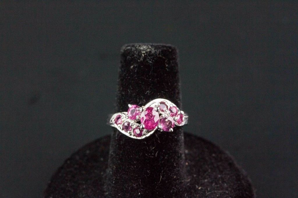 Sterling silver swirl style ring; set with one 0.60ct oval shape natural ruby, and eight round shape natural rubies weight 0.28ct; certified replacement value $625; 3.5 grams