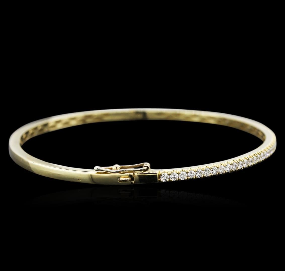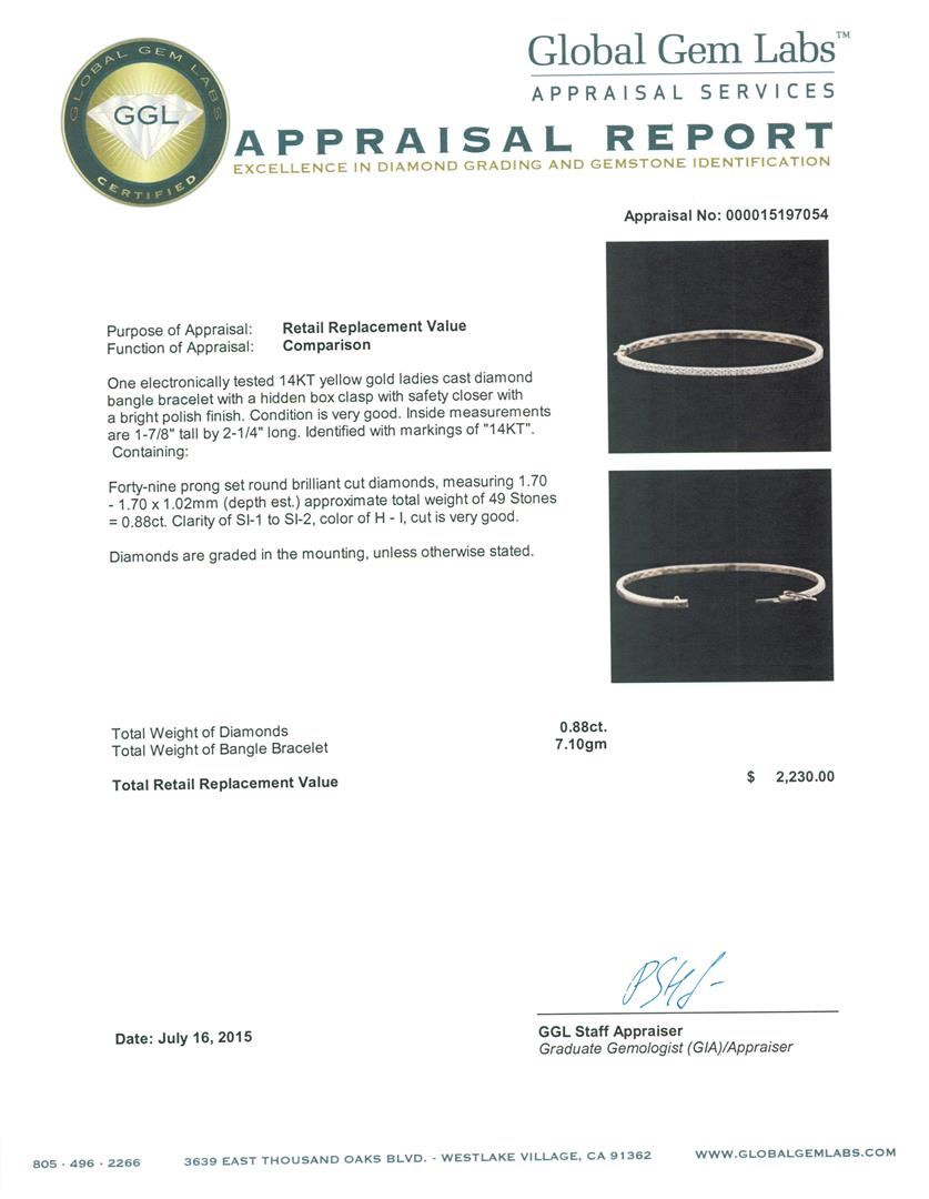 One electronically tested 14KT yellow gold ladies cast diamond bangle bracelet with a hidden box clasp with safety closer with a bright polish finish. Identified with markings of "14KT". Condition is very good. Containing: Forty-Nine prong set round brilliant cut diamonds, measuring 1.70 - 1.70 x 1.02mm (depth est.) approximate total weight of 49 Stones = 0.88ct. Clarity: SI-1 to SI-2. Color: H - I, Cut is Very Good. Diamonds are graded in the mounting, unless otherwise stated. Total Weight of Diamonds 0.88ct. Total Weight of Bangle Bracelet 7.10 grams. GGL Appraised at $19,340.00.