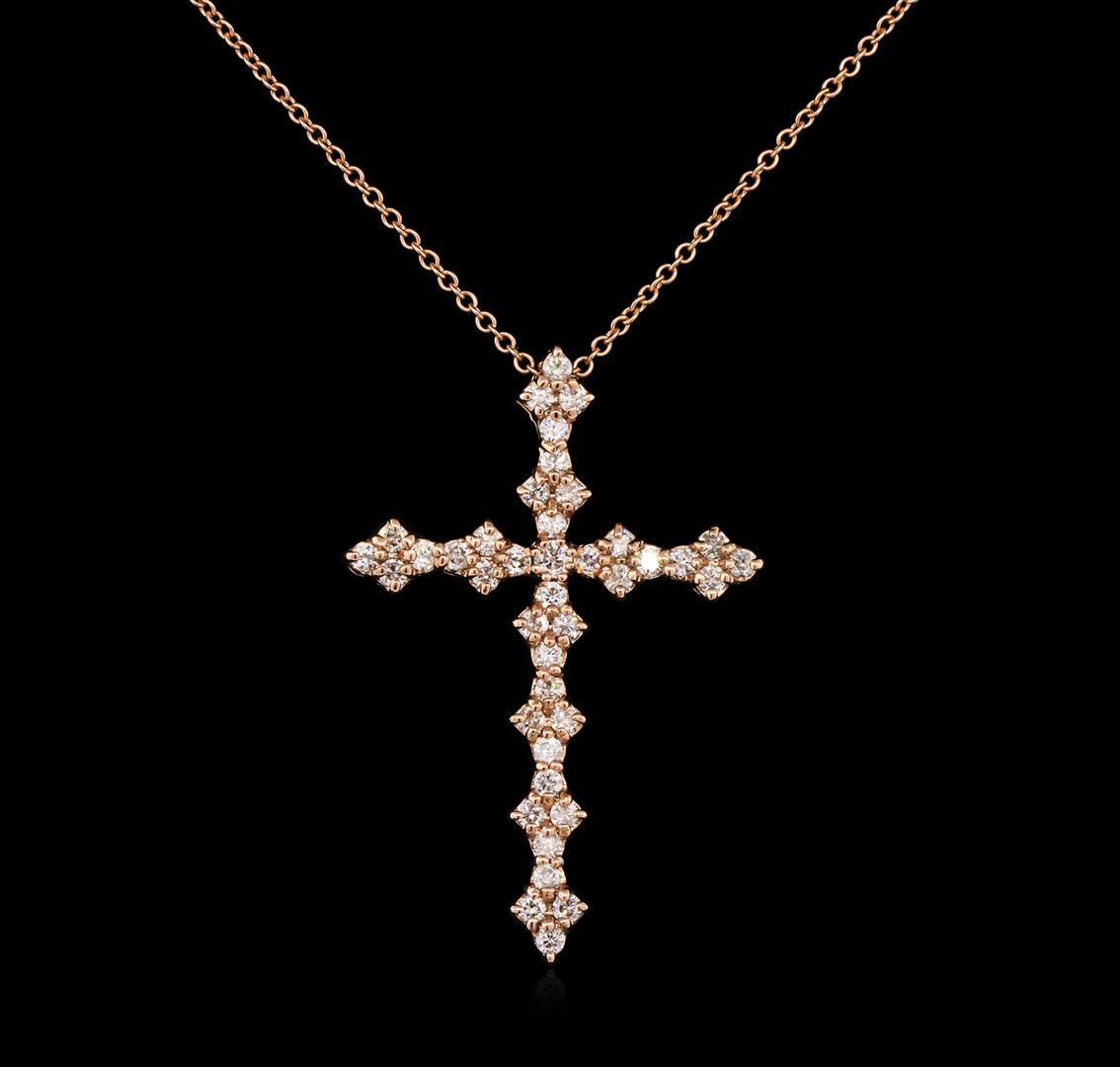 One cross pendant with chain featuring: 14KT rose gold weighing 3.05 grams containing 41 diamonds with a total weight of 0.88ct.