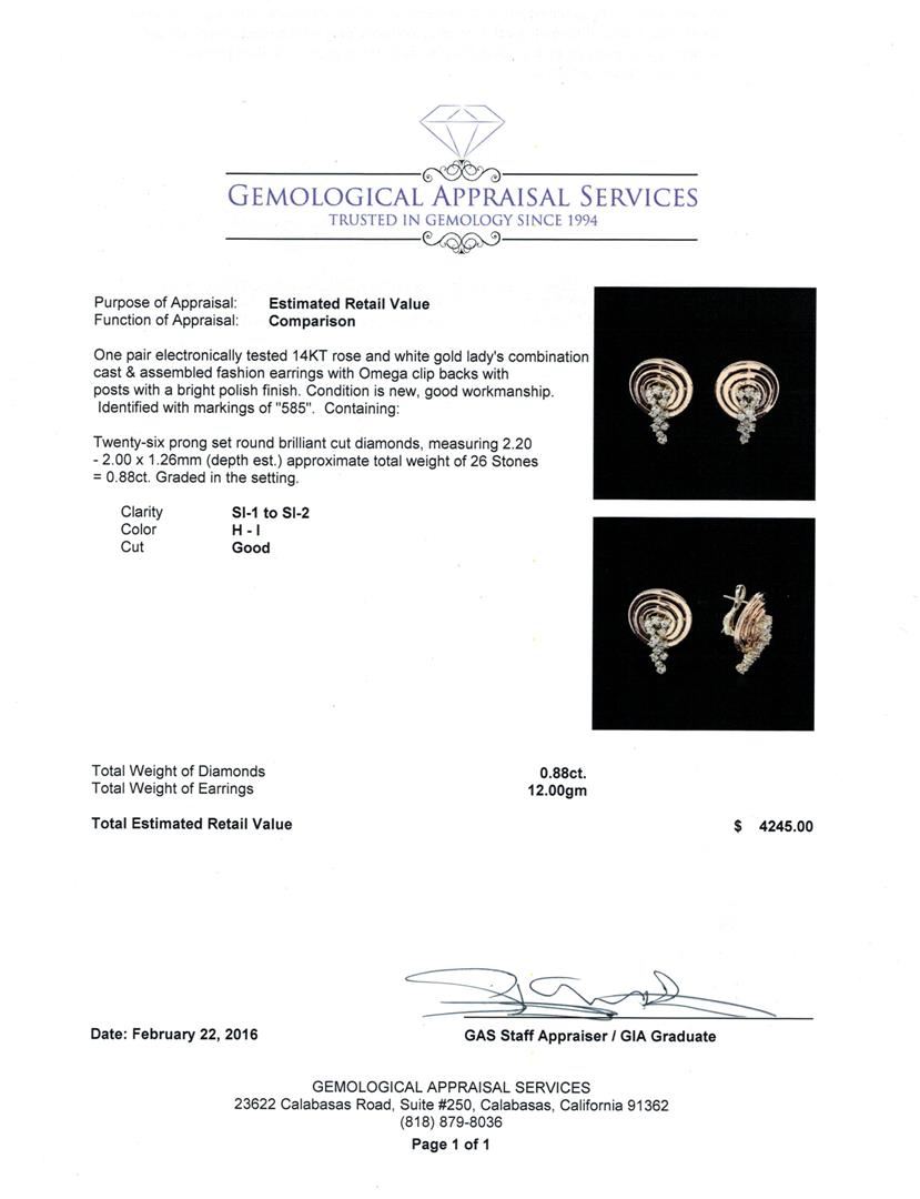 One pair electronically tested 14KT rose and white gold lady's combination cast & assembled fashion earrings with Omega clip backs with posts with a bright polish finish. Identified with markings of "585". Condition is new, good workmanship. Containing: Twenty-Six prong set round brilliant cut diamonds, measuring 2.20 - 2.00 x 1.26mm (depth est.) approximate total weight of 26 Stones = 0.88ct. Graded in the setting. Clarity: SI-1 to SI-2. Color: H - I. Cut Good. Total Weight of Diamonds 0.88ct. Total Weight of Earrings 12.00gm. GAS Appraised at $4,245.00.