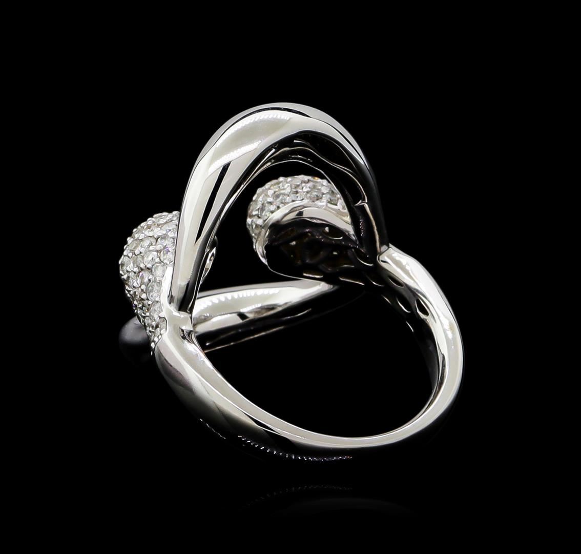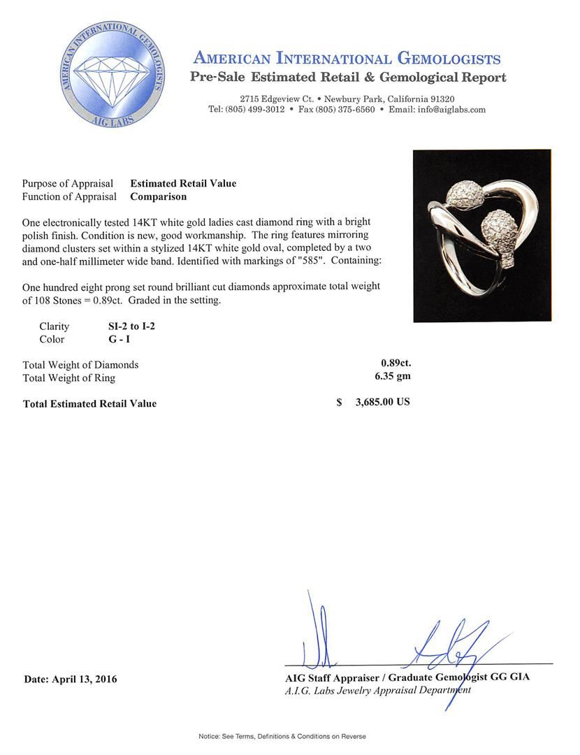 One electronically tested 14KT white gold ladies cast diamond ring with a bright polish finish. The ring features mirroring diamond clusters set within a stylized 14KT white gold oval, completed by a two and one-half millimeter wide band. Identified with markings of "585". Condition is new, good workmanship. Containing: One Hundred Eight prong set round brilliant cut diamonds approximate total weight of 108 Stones = 0.89ct. Graded in the setting. Clarity: SI-2 to I-2. Color: G - I. Total Weight of Diamonds 0.89ct. Total Weight of Ring 6.35gm. AIG Appraised.