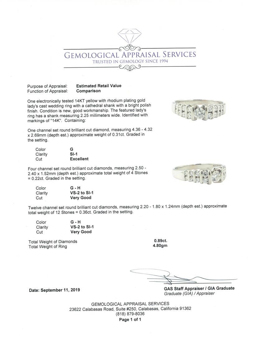 One electronically tested 14KT yellow with rhodium plating gold lady's cast wedding ring with a cathedral shank with a bright polish finish. The featured lady's ring has a shank measuring 2.25 millimeters wide. Identified with markings of '14K'. Condition is new, good workmanship. Containing: One channel set round brilliant cut diamond, measuring 4.36 - 4.32 x 2.69mm (depth est.) approximate weight of 0.31ct. Graded in the setting. Color G Clarity SI-1 Cut Excellent Four channel set round brilliant cut diamonds, measuring 2.50 - 2.40 x 1.52mm (depth est.) approximate total weight of 4 Stones = 0.22ct. Graded in the setting. Color G - H Clarity VS-2 to SI-1 Cut Very Good Twelve channel set round brilliant cut diamonds, measuring 2.20 - 1.80 x 1.24mm (depth est.) approximate total weight of 12 Stones = 0.36ct. Graded in the setting. Color G - H Clarity VS-2 to SI-1 Cut Very Good. Total Weight of Diamonds 0.89ct.. Total Weight of Ring 4.80gm GAS Appraised at $4715.00. GAS Appraised.