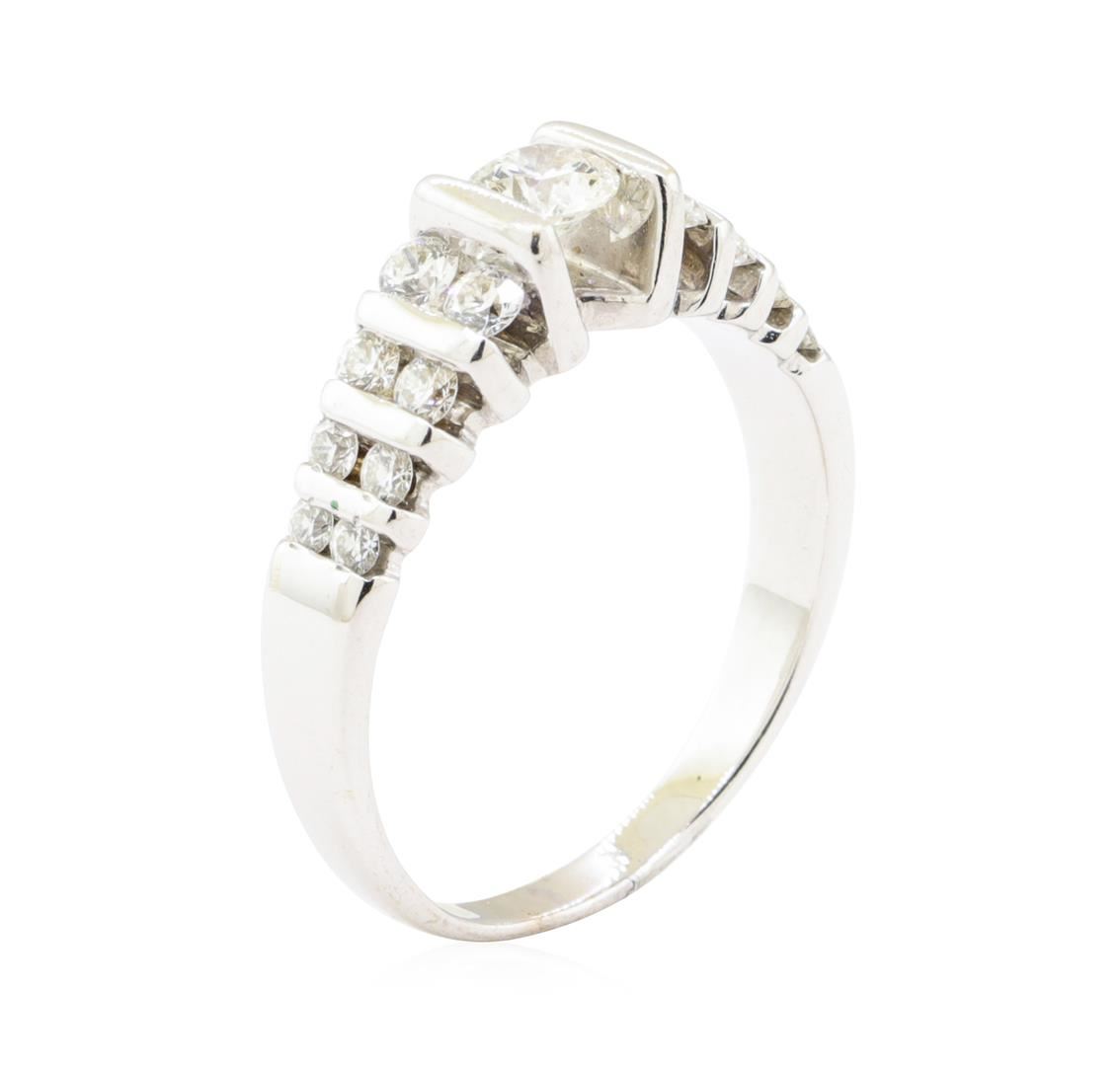 One electronically tested 14KT yellow with rhodium plating gold lady's cast wedding ring with a cathedral shank with a bright polish finish. The featured lady's ring has a shank measuring 2.25 millimeters wide. Identified with markings of '14K'. Condition