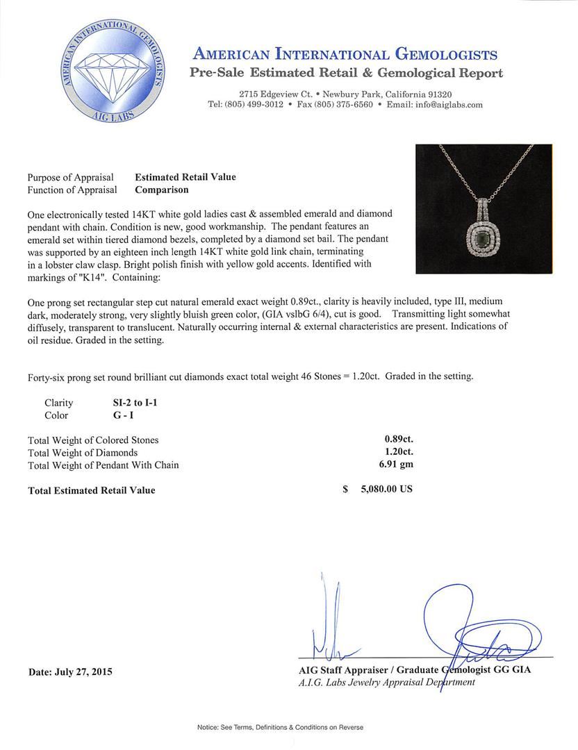 One electronically tested 14KT white gold ladies cast & assembled emerald and diamond pendant with chain. The pendant features an emerald set within tiered diamond bezels, completed by a diamond set bail. The pendant was supported by an eighteen inch length 14KT white gold link chain, terminating in a lobster claw clasp. Bright polish finish with yellow gold accents. Identified with markings of "K14". Condition is new, good workmanship. Containing: One prong set rectangular step cut natural emerald exact weight 0.89ct., clarity is heavily included, type III, medium dark, moderately strong, very slightly bluish green color, (GIA vslbG 6/4), cut is good. Transmitting light somewhat diffusely, transparent to translucent. Naturally occurring internal & external characteristics are present. Indications of oil residue. Graded in the setting. Forty-Six prong set round brilliant cut diamonds exact total weight 46 Stones = 1.20ct. Graded in the setting. Clarity: SI-2 to I-1. Color: G - I. Total Weight of Colored Stones 0.89ct. Total Weight of Diamonds 1.20ct. Total Weight of Pendant With Chain 6.91gm. AIG Appraised at $5,080.00.