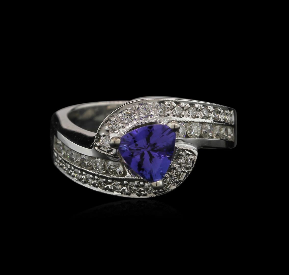 One ring featuring: 14KT white gold weighing 8.23 grams containing one prong set pyramid shape tanzanite center stone with a total weight of 0.89ct and pave and channel set round diamonds with a total weight of 0.67ct.
