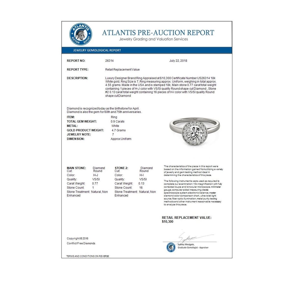 REF-187X5T -26314 ---- 0.9 CTW Certified VS/SI Diamond Solitaire Halo Ring 18K White Gold ---- Luxury Designer Brand Ring Appraised at $10,300 Certificate Number US26314 18k White gold, Ring Size is 7, Ring measuring approx. Uniform, weighing in total approx. 4.55 grams. Made in the USA and is stamped 18k, Main stone 0.77 carat total weight containing 1 pieces of H-J color with VS/SI quality Round shape cut Diamond , Stone #2 0.13 carat total weight containing 16 pieces of H-I color with VS/SI quality Round shape cut Diamond
