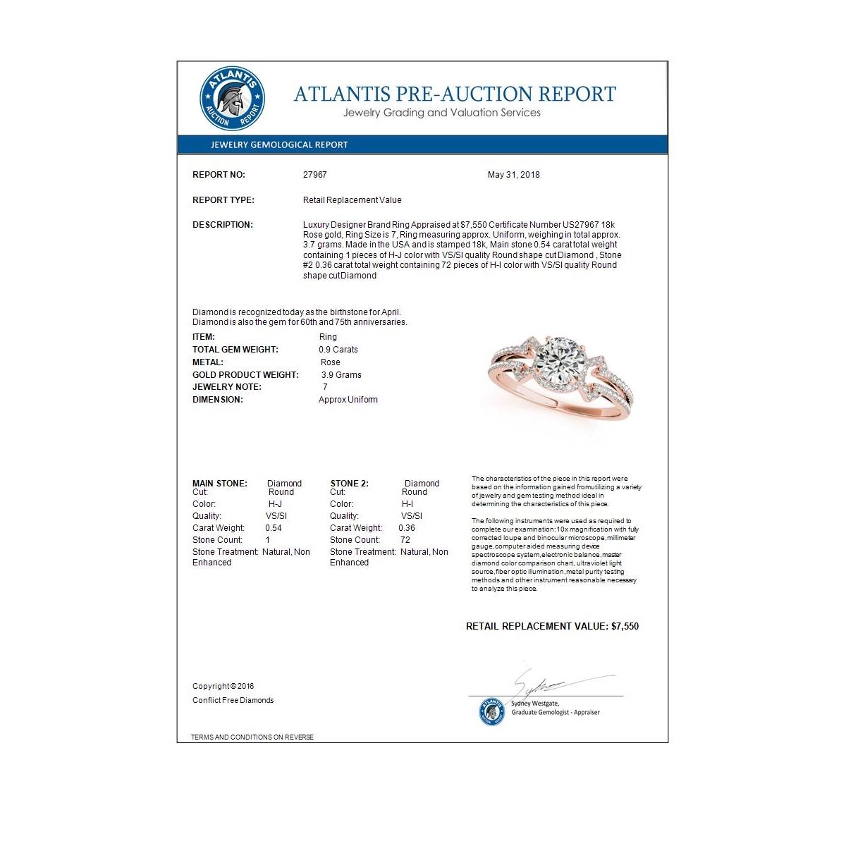 REF-152T8M -27967 ---- 0.9 CTW Certified VS/SI Diamond Solitaire Ring 18K Rose Gold ---- Luxury Designer Brand Ring Appraised at $7,550 Certificate Number US27967 18k Rose gold, Ring Size is 7, Ring measuring approx. Uniform, weighing in total approx. 3.7 grams. Made in the USA and is stamped 18k, Main stone 0.54 carat total weight containing 1 pieces of H-J color with VS/SI quality Round shape cut Diamond , Stone #2 0.36 carat total weight containing 72 pieces of H-I color with VS/SI quality Round shape cut Diamond