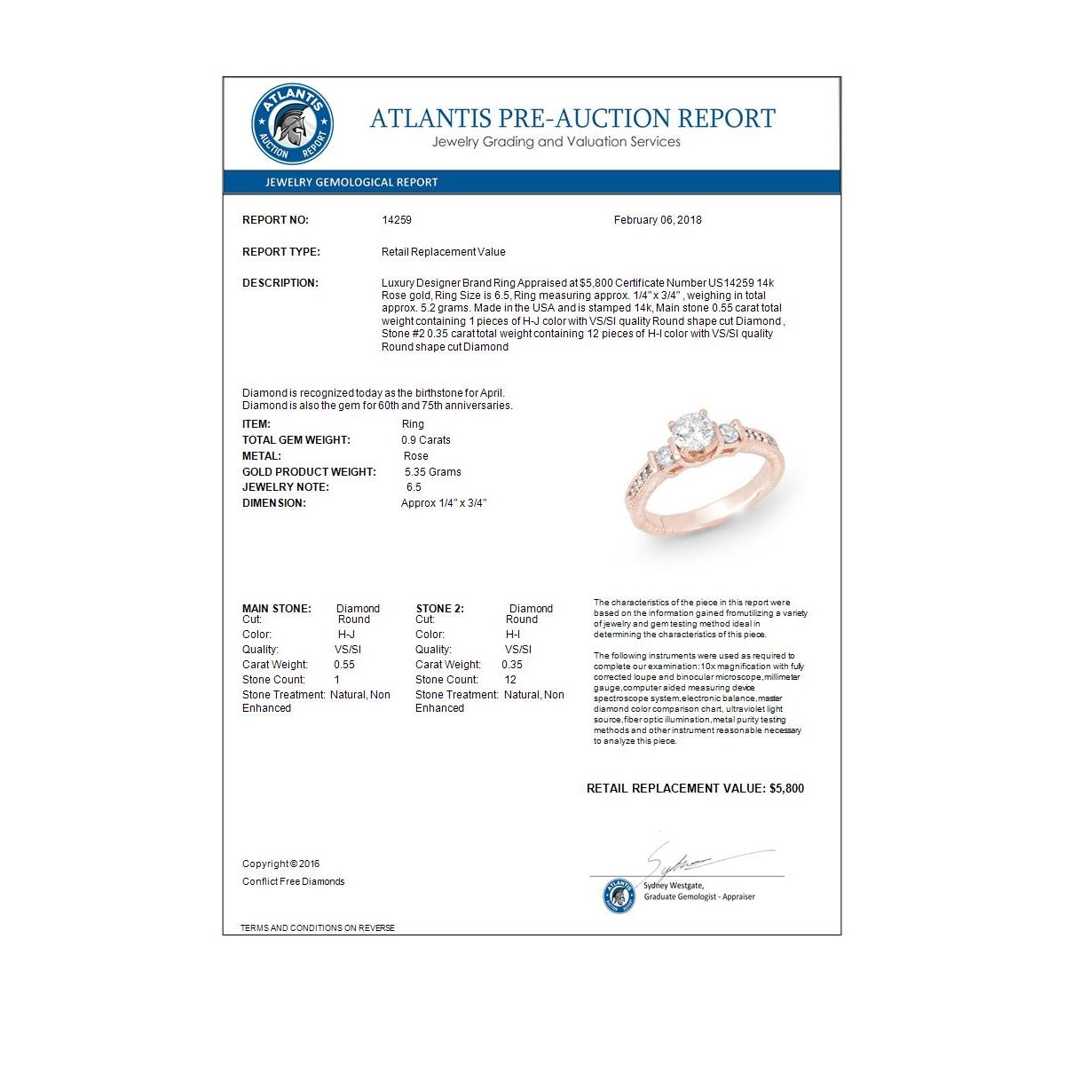REF-131X8T -14259 ---- 0.90 CTW Certified VS/SI Diamond Solitaire Ring 14K Rose Gold ---- Luxury Designer Brand Ring Appraised at $5,800 Certificate Number US14259 14k Rose gold, Ring Size is 6.5, Ring measuring approx. 1/4" x 3/4" , weighing in total approx. 5.2 grams. Made in the USA and is stamped 14k, Main stone 0.55 carat total weight containing 1 pieces of H-J color with VS/SI quality Round shape cut Diamond , Stone #2 0.35 carat total weight containing 12 pieces of H-I color with VS/SI quality Round shape cut Diamond