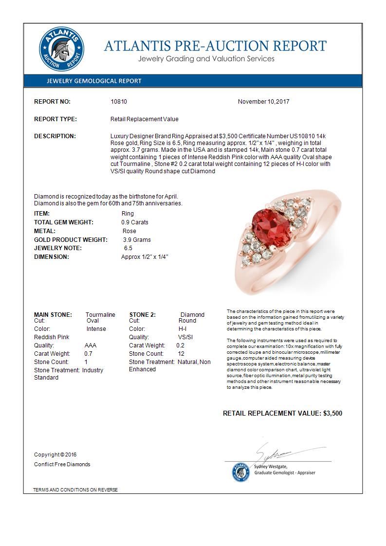 REF-45W5F -10810 ---- 0.90 CTW Pink Tourmaline & Diamond Ring 14K Rose Gold ---- Luxury Designer Brand Ring Appraised at $3,500 Certificate Number US10810 14k Rose gold, Ring Size is 6.5, Ring measuring approx. 1/2" x 1/4" , weighing in total approx. 3.7 grams. Made in the USA and is stamped 14k, Main stone 0.7 carat total weight containing 1 pieces of Intense Reddish Pink color with AAA quality Oval shape cut Tourmaline , Stone #2 0.2 carat total weight containing 12 pieces of H-I color with VS/SI quality Round shape cut Diamond