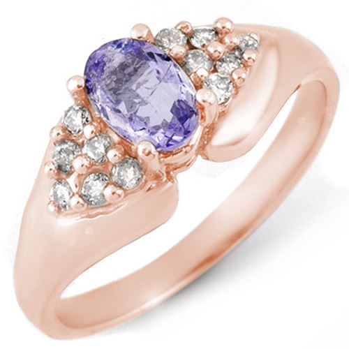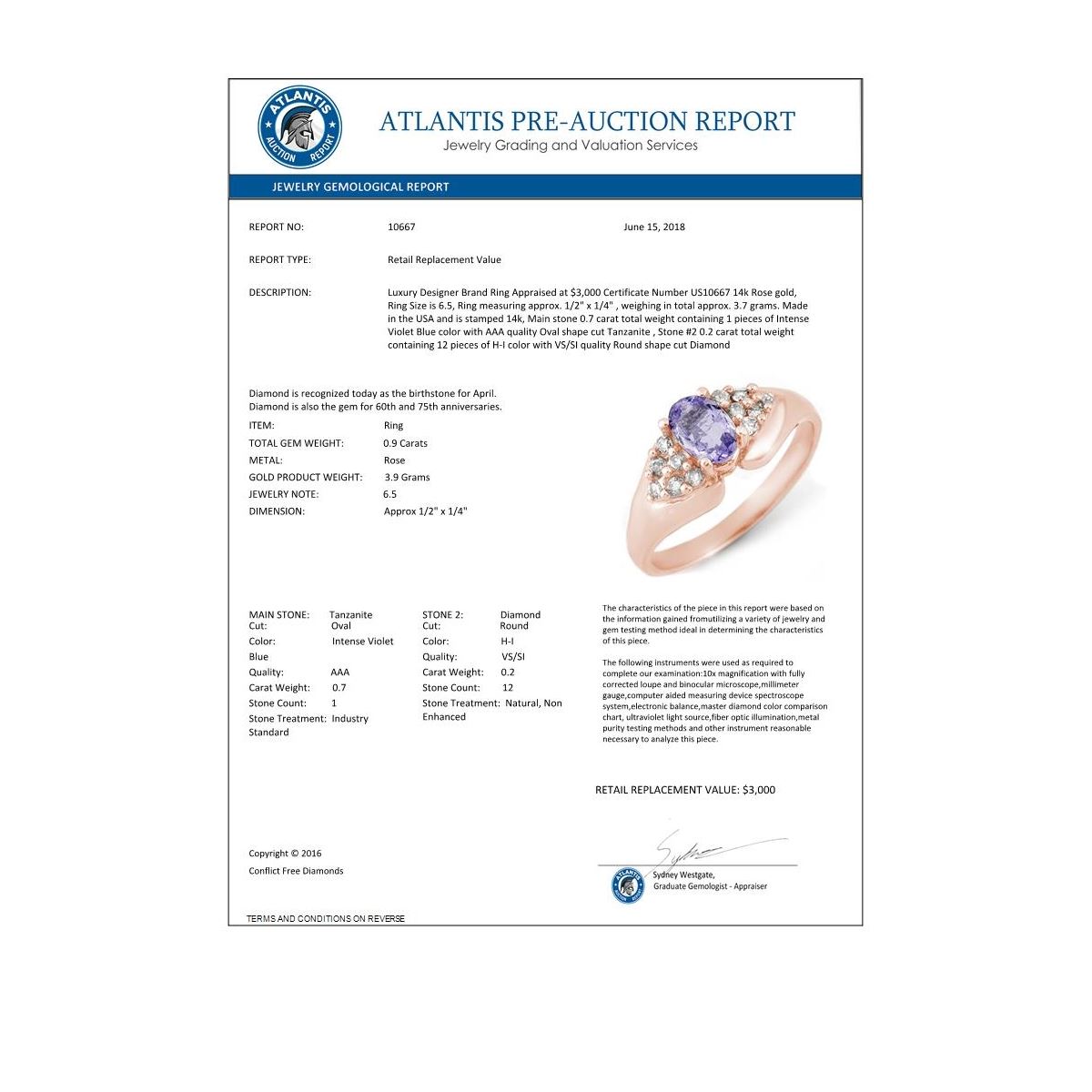 REF-41N8Y -10667 ---- 0.90 CTW Tanzanite & Diamond Ring 14K Rose Gold ---- Luxury Designer Brand Ring Appraised at $3,000 Certificate Number US10667 14k Rose gold, Ring Size is 6.5, Ring measuring approx. 1/2" x 1/4" , weighing in total approx. 3.7 grams. Made in the USA and is stamped 14k, Main stone 0.7 carat total weight containing 1 pieces of Intense Violet Blue color with AAA quality Oval shape cut Tanzanite , Stone #2 0.2 carat total weight containing 12 pieces of H-I color with VS/SI quality Round shape cut Diamond