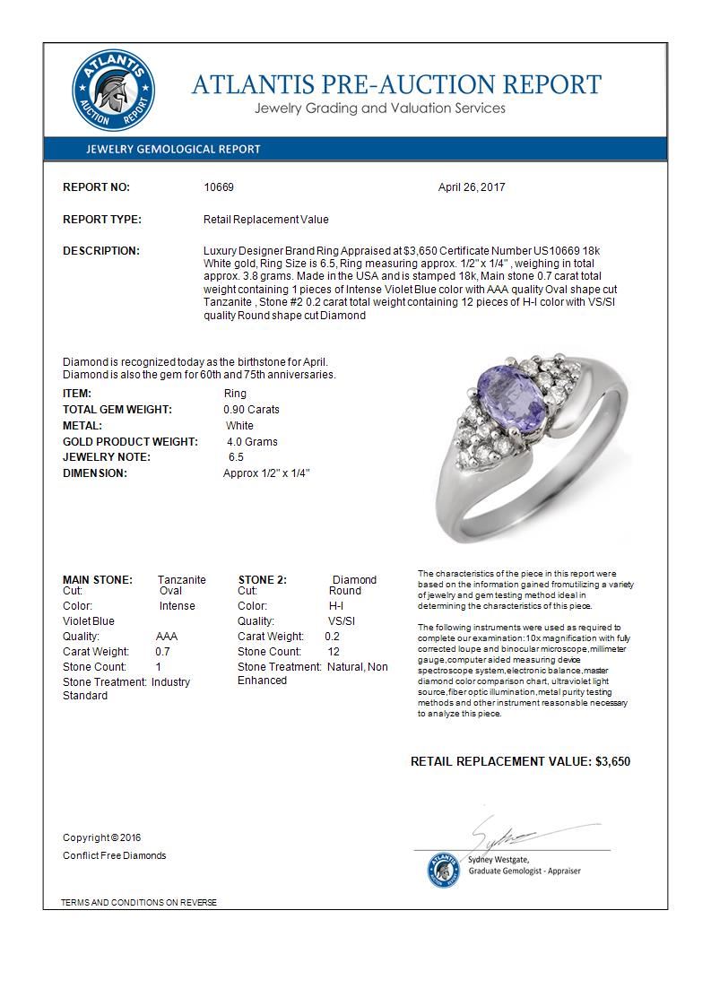 0.90 CTW Tanzanite & Diamond Ring 18K White Gold ---- Luxury Designer Brand Ring Appraised Retail Price at $3,650 ---- SKU Number US10669 18k White gold Ring Size is 6.5, Ring measuring approx. 1/2" x 1/4" , weighing in total approx. 3.8 grams. Made in the USA and is stamped 18k, Main stone 0.7 carat total weight containing 1 pieces of Intense Violet Blue color with AAA quality Oval shape cut Tanzanite , Stone #2 0.2 carat total weight containing 12 pieces of H-I color with VS/SI quality Round shape cut