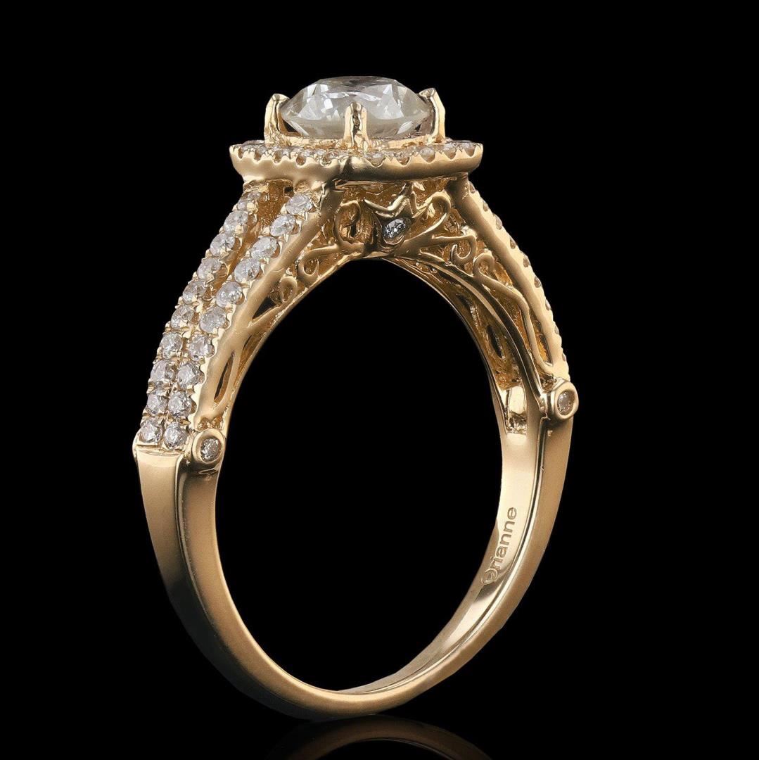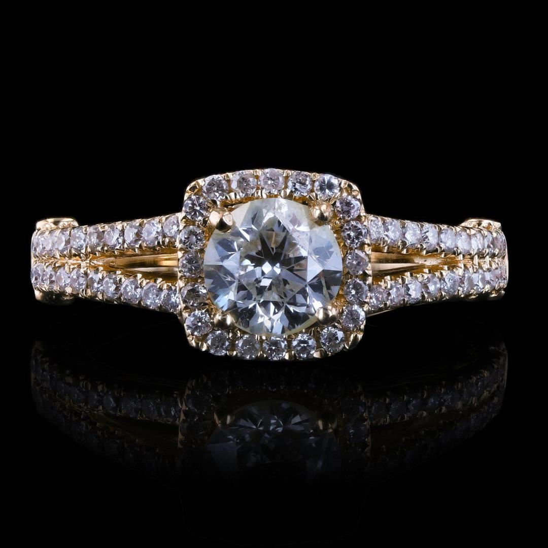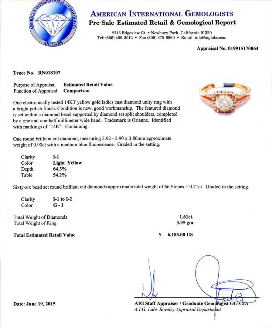 One electronically tested 14KT yellow gold ladies cast diamond unity ring with a bright polish finish. Condition is new, good workmanship. The featured diamond is set within a diamond bezel supported by diamond set split shoulders, completed by a one and one-half millimeter wide band. Trademark is Orianne. Identified with markings of "14K". One round brilliant cut diamond, measuring 5.92 - 5.90 x 3.80mm approximate weight of 0.90ct with a medium blue fluorescence. Graded in the setting. Clarity I-1 Color Light Yellow Depth 64.3% Table 54.2% Sixty-six bead set round brilliant cut diamonds approximate total weight of 66 Stones = 0.71ct. Graded in the setting. Clarity I-1 to I-2 Color G-I Total Weight of Diamonds 1.61ct. Total Weight of Riiig 3.93 gm Size: 7