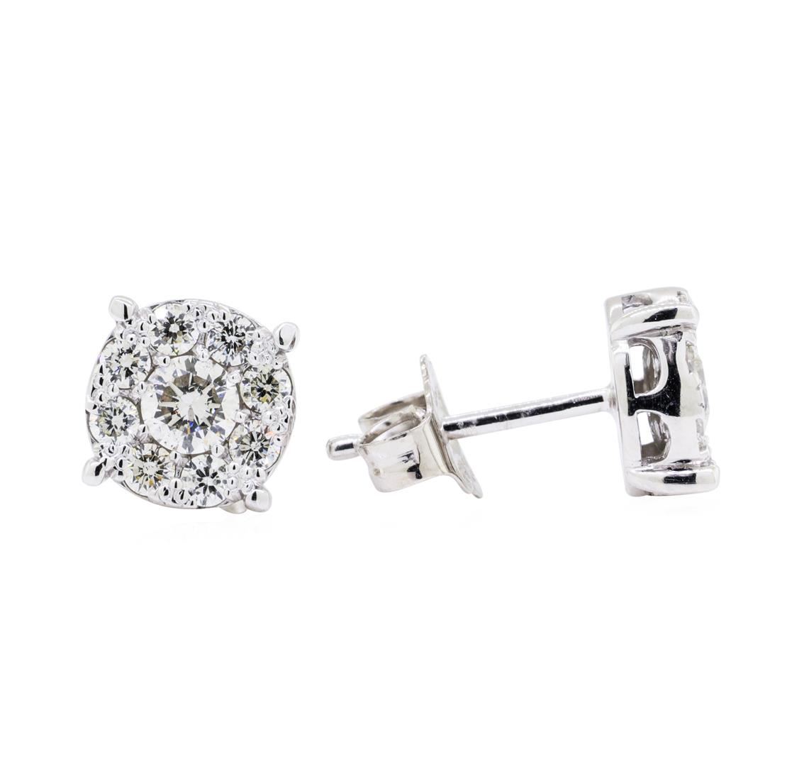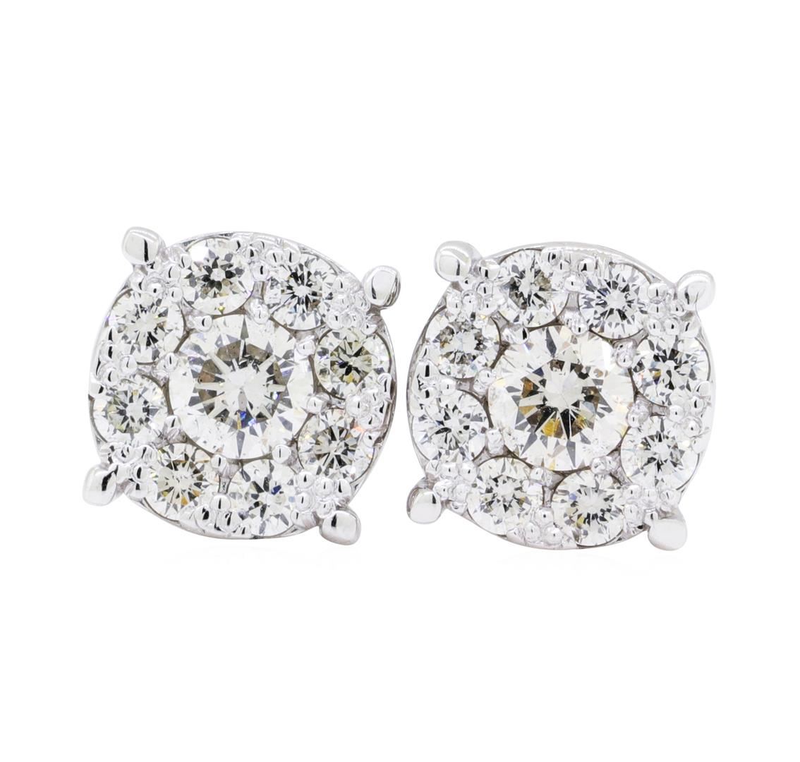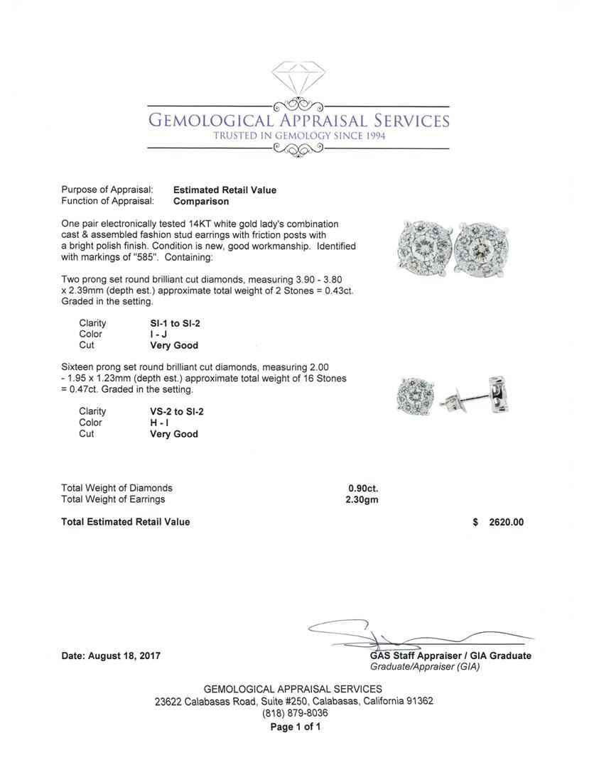 One pair electronically tested 14KT white gold lady's combination cast & assembled fashion stud earrings with friction posts with a bright polish finish. Identified with markings of '585'. Condition is new, good workmanship. Containing: Two prong set round brilliant cut diamonds, measuring 3.90 - 3.80 x 2.39mm (depth est.) approximate total weight of 2 Stones = 0.43ct. Graded in the setting. Color I - J Clarity SI-1 to SI-2 Cut Very Good Sixteen prong set round brilliant cut diamonds, measuring 2.00 - 1.95 x 1.23mm (depth est.) approximate total weight of 16 Stones = 0.47ct. Graded in the setting. Color H - I Clarity VS-2 to SI-2 Cut Very Good. Total Weight of Diamonds 0.90ct.. Total Weight of Earrings 2.30gm GAS Appraised at $2620.00. GAS Appraised at $2,620.00.