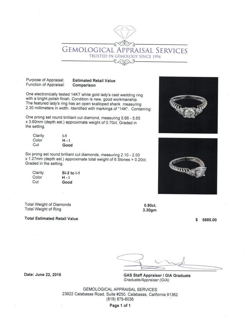 One electronically tested 14KT white gold lady's cast wedding ring with a bright polish finish. The featured lady's ring has an open scalloped shank measuring 2.30 millimeters in width. Identified with markings of "14K". Condition is new, good workmanship. Containing: One prong set round brilliant cut diamond, measuring 5.66 - 5.65 x 3.60mm (depth est.) approximate weight of 0.70ct. Graded in the setting. Clarity: I-1. Color: H - I. Cut Good Six prong set round brilliant cut diamonds, measuring 2.10 - 2.00 x 1.27mm (depth est.) approximate total weight of 6 Stones = 0.20ct. Graded in the setting. Clarity: SI-2 to I-1. Color: H - I. Cut Good. Total Weight of Diamonds 0.90ct. Total Weight of Ring 3.30gm. GAS Appraised.